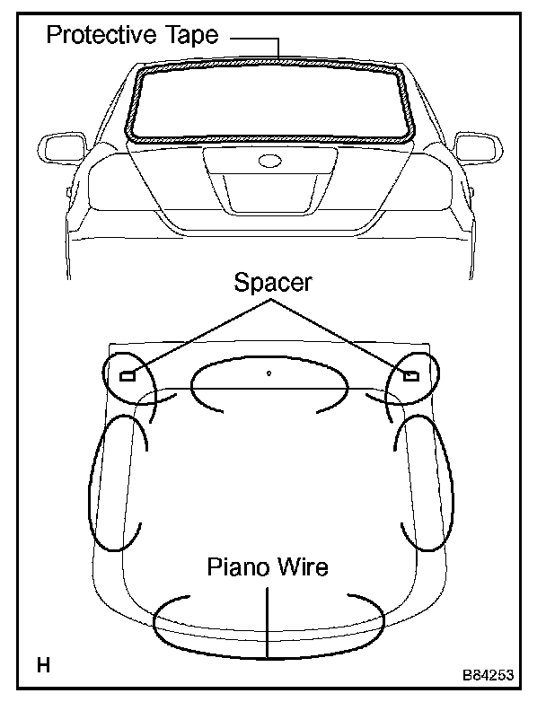 b. From the interior, insert piano wires between the vehicle body and back door glass as shown in the illustration.