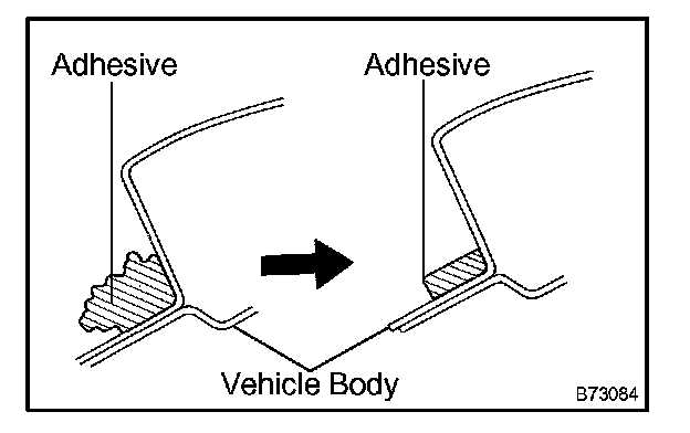 1. On the contact surface of the vehicle body, use a knife to cut away excess adhesive as shown in the illustration.
