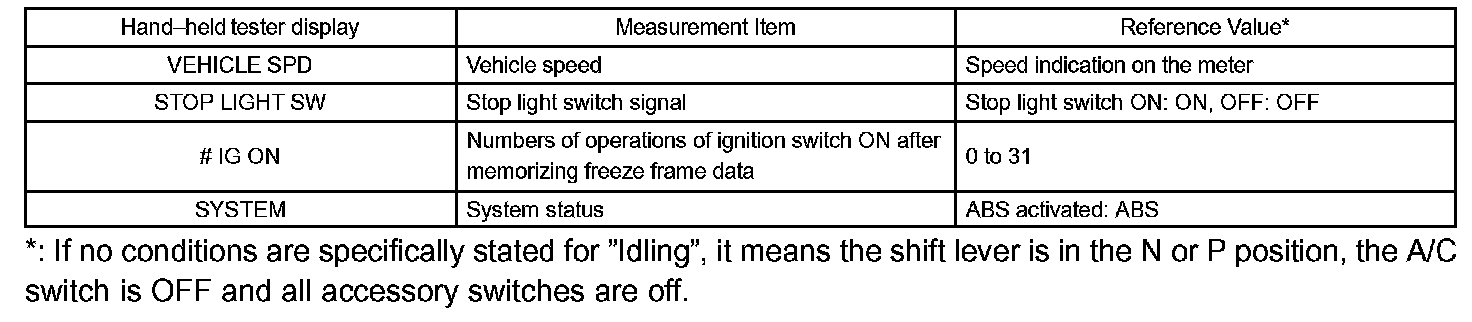 FREEZE FRAME DATA OF ABSa. The vehicle (sensor) status stored during ABS operation or at the time of an error code detection can be displayed on the hand-held tester.