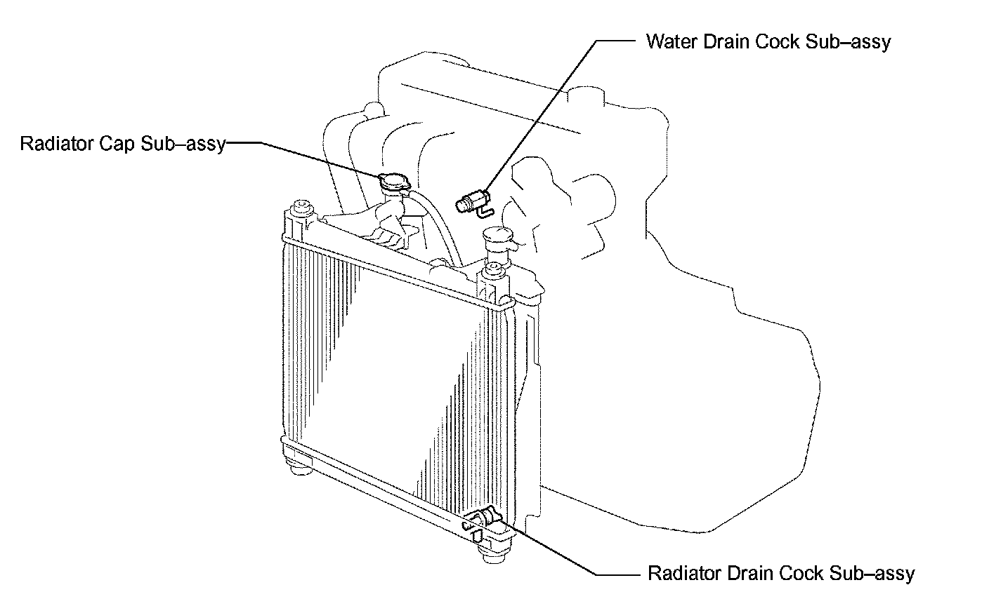 b. Drain engine coolant by loosening the drain cock of the radiator and the water drain cock plug of the water drain cock.