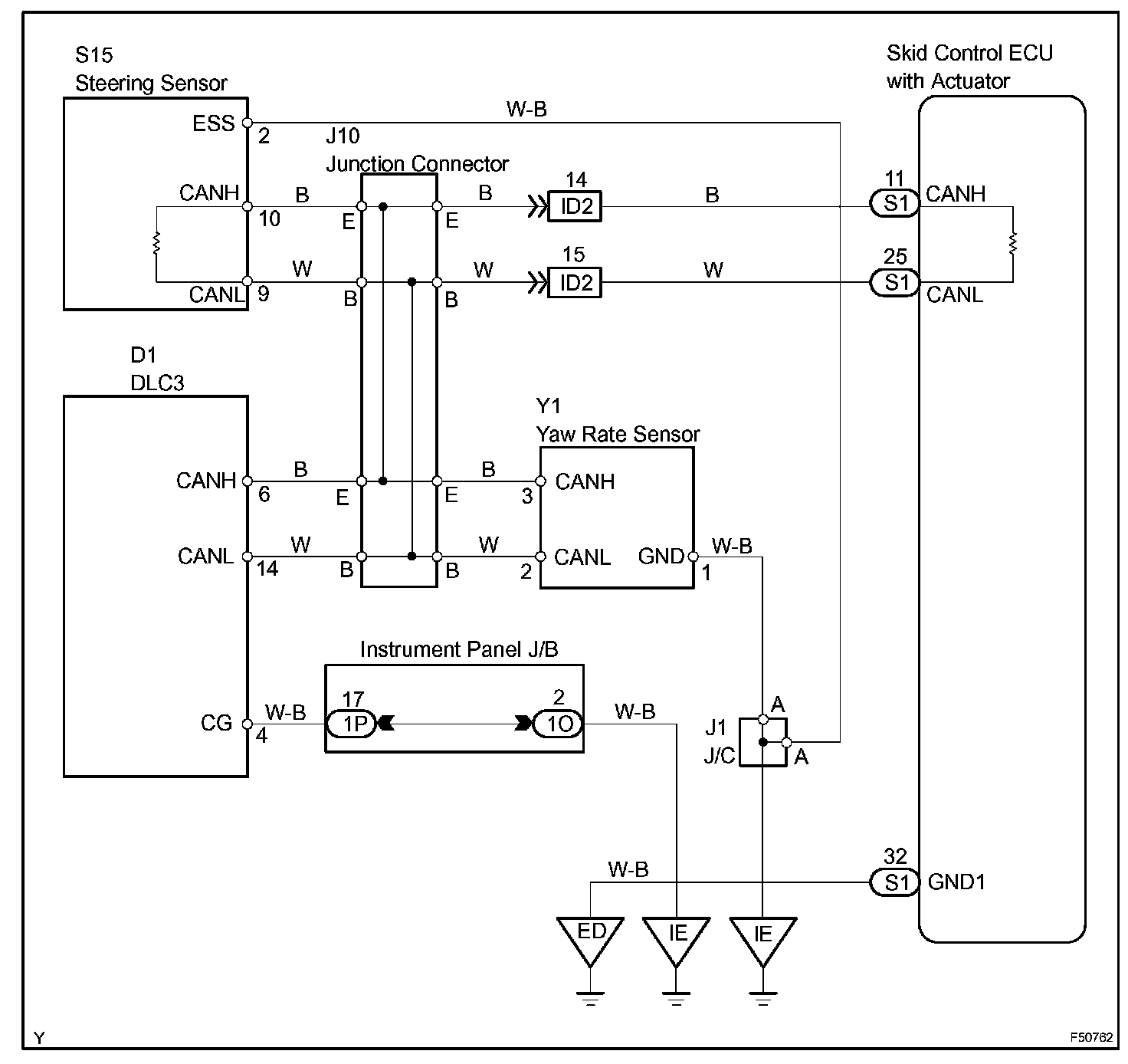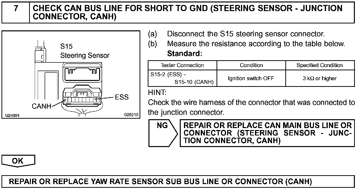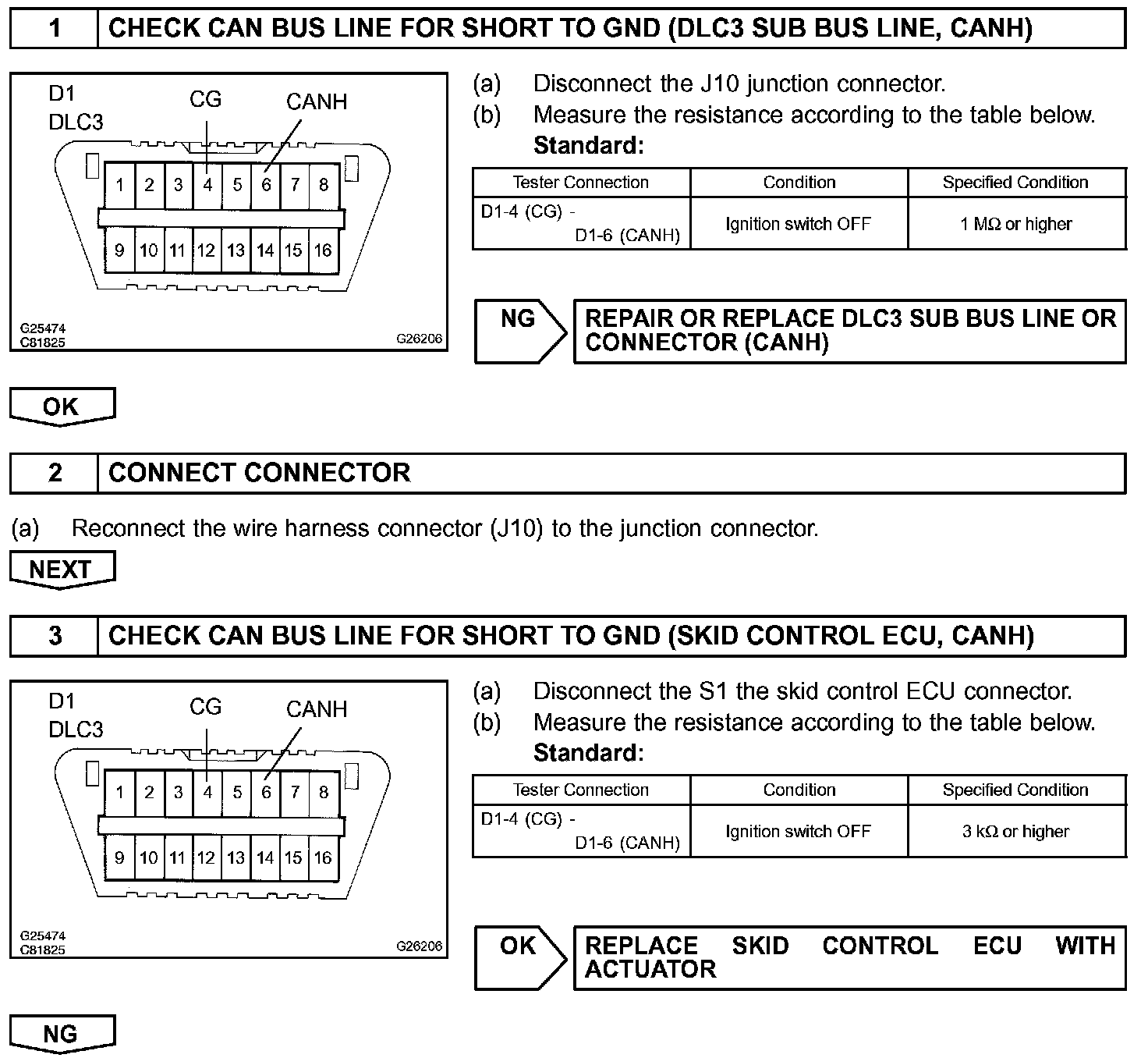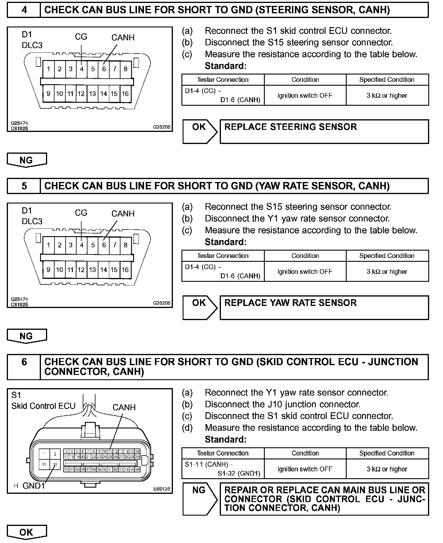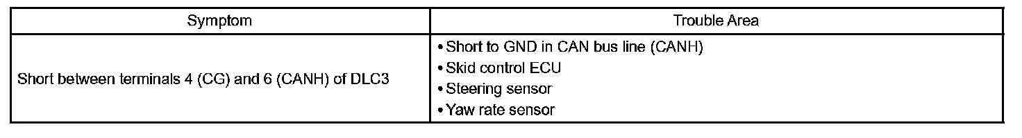CHECK CAN BUS LINE (CAN H) FOR SHORT TO GNDCIRCUIT DESCRIPTIONA short to GND may be occurring in the CAN bus line when there is a short between terminals 4 (CG) and 6 (CANH) of the
