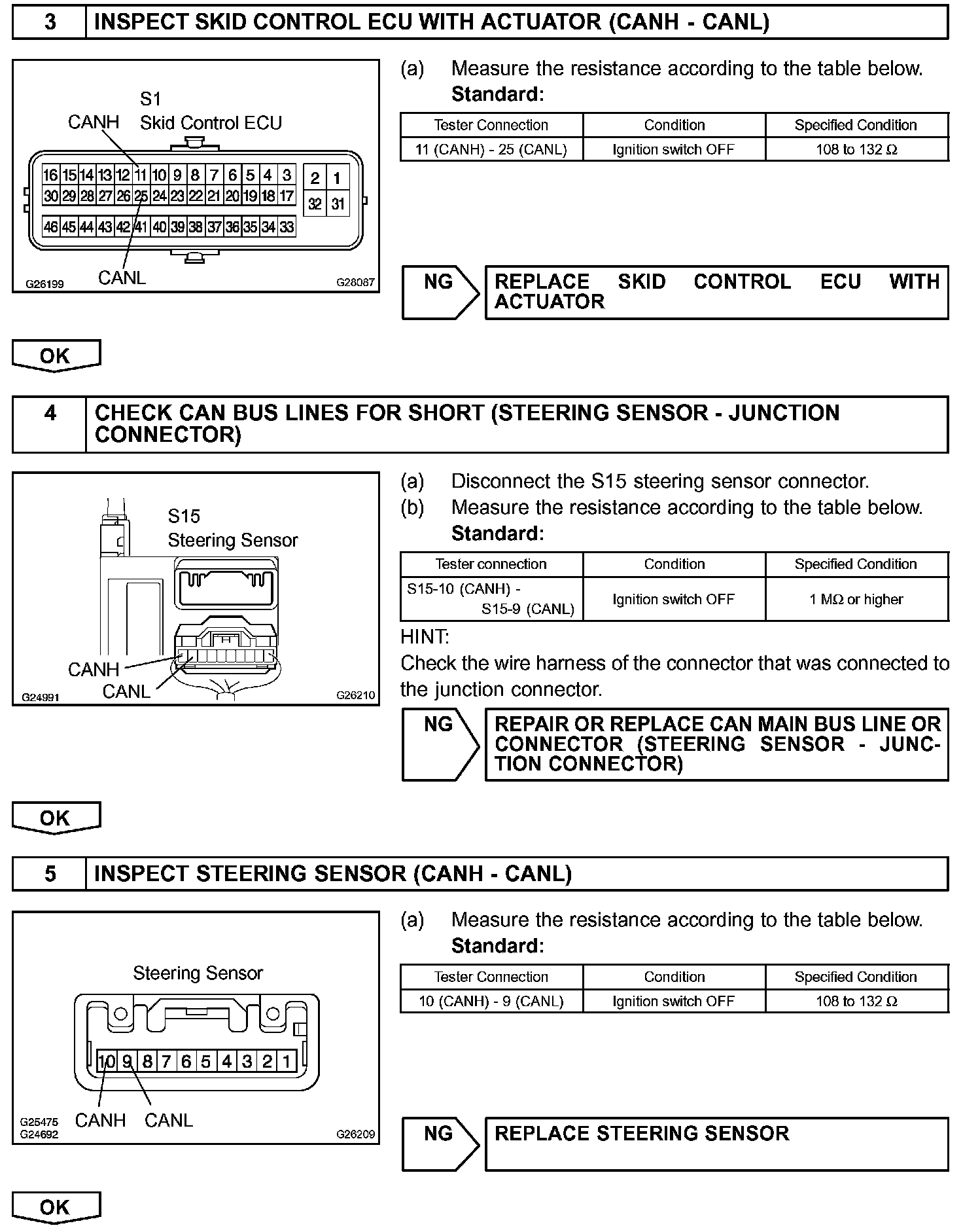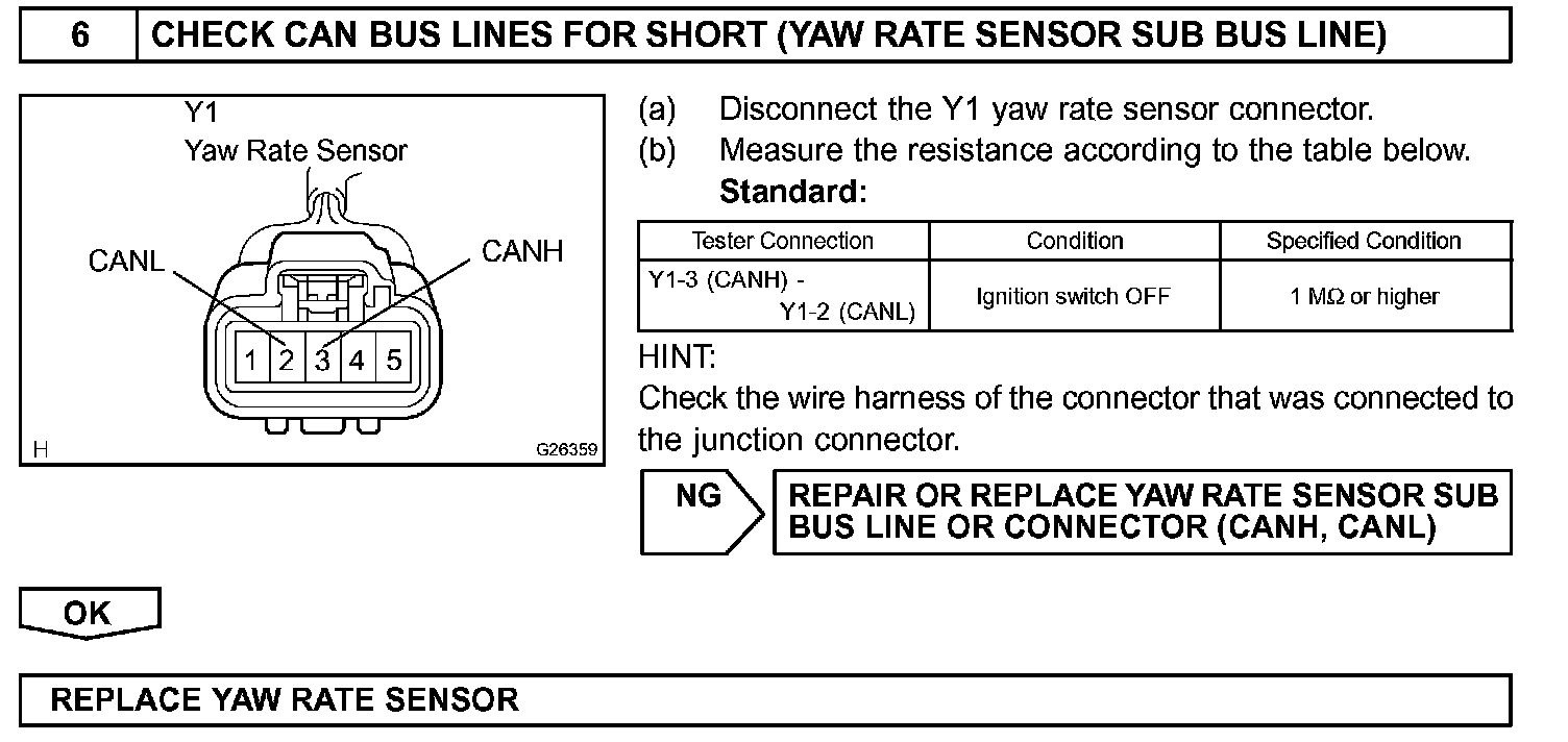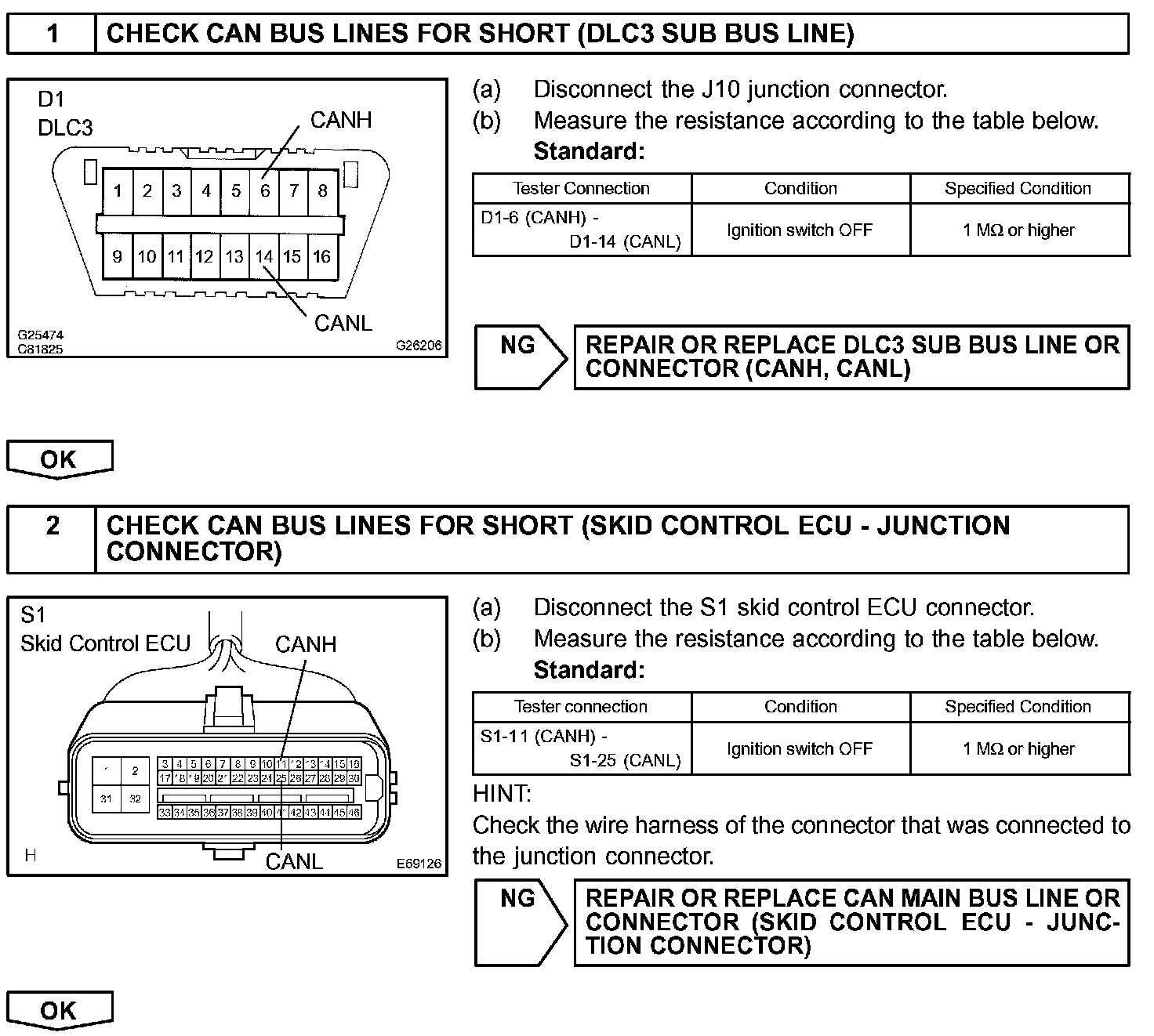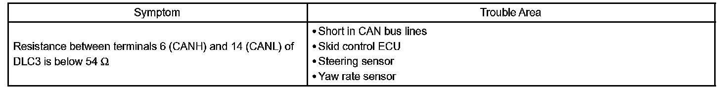 CHECK CAN BUS LINES FOR SHORT CIRCUITCIRCUIT DESCRIPTIONThe CAN bus lines are considered to be shorted when the resistance between terminals 6 (CANH) and 14 (CANL) of the