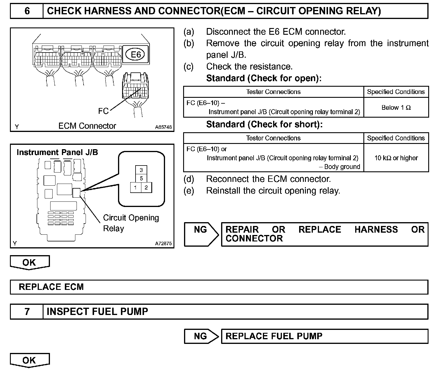 When the STA and NE signals are received by the ECM, Tr (power transistor) is switched on, allowing a current to flow into the circuit opening relay coil. The circuit opening relay switches on, power is supplied to the fuel pump and the fuel pump operates.