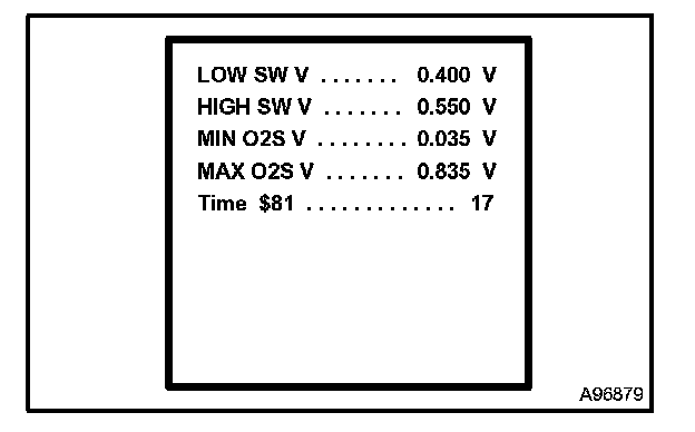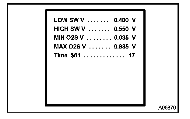 NOTE: Until the HO2 sensor monitor runs to completion, when it fails to complete or when the ignition switch is turned to OFF, the tester screen displays the upper and lower view-able limit values for the monitor (for example, voltages: 0 V and 1.275 V, seconds: 0 and 10.2, and Test Value: 0 and 255).