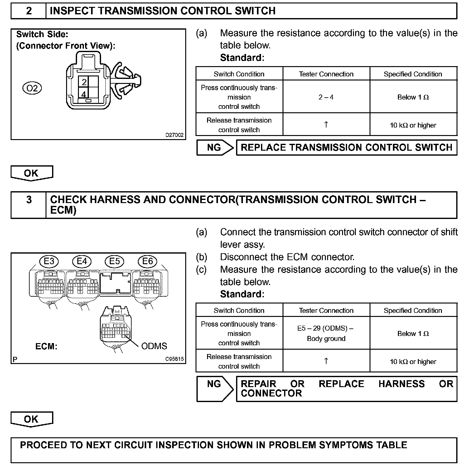 The O/D main switch (transmission control switch) is a momentary type switch. When pressing the O/D main switch, the O/D OFF indicator light lights up and the ECM prohibits shifting into O/D, and when pressing it once again, the O/D OFF indicator light goes off and the ECM allows shifting into O/D. Turning the IG switch OFF will reset the O/D OFF indicator light.