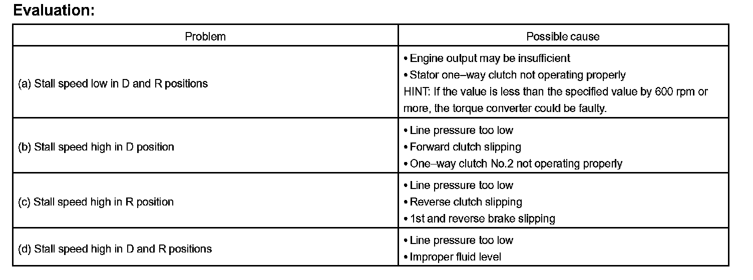 The object of this test is to check the overall performance of the transaxle and engine by measuring the stall speeds in the D and R positions.