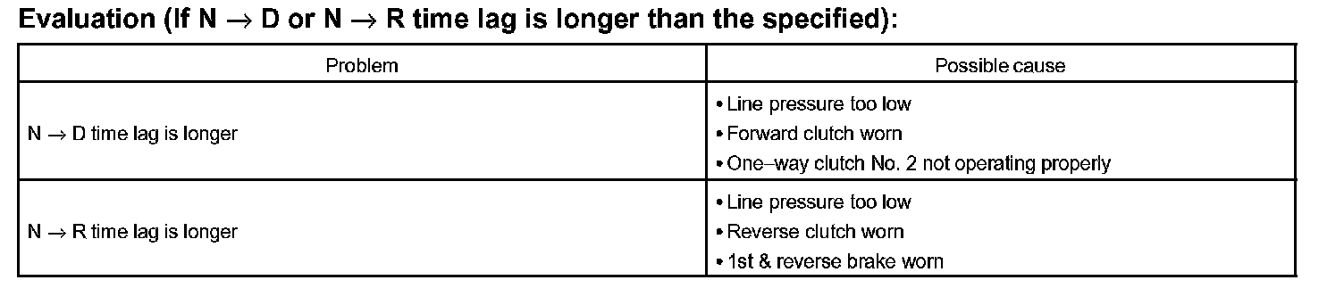 1. When the shift lever is shifted while the engine is idling, there will be a certain time lapse or lag before the shock can be felt. This is used for checking the condition of the direct clutch, forward clutch, and 1st and reverse brake.