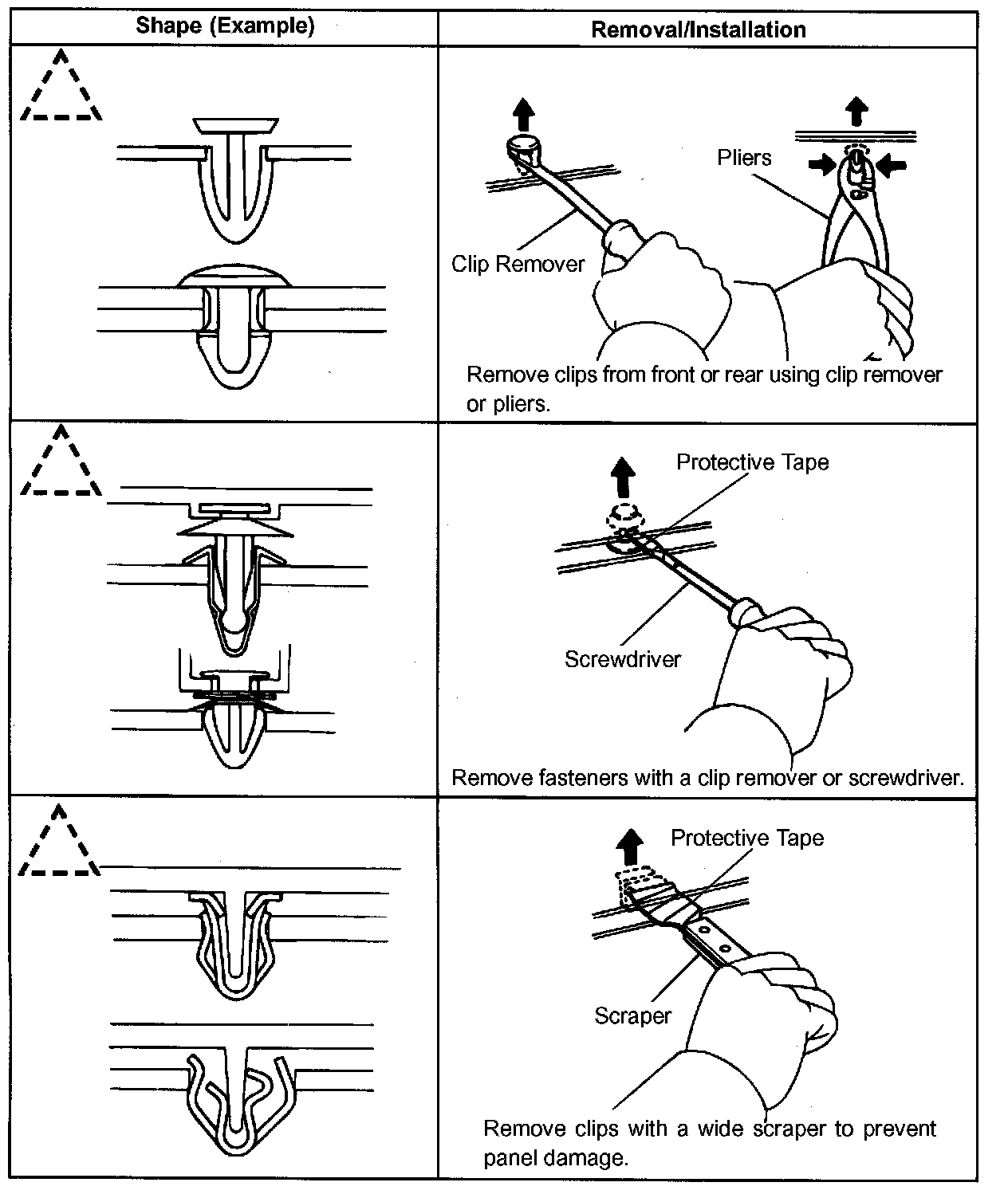 1. The removal and installation methods of typical clips used in body parts are shown in the table.