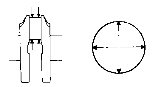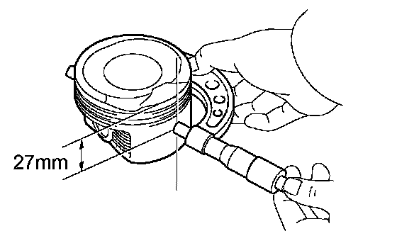 Using a micrometer, measure the piston diameter at right angles to the piston pin center line, and at a position 27 mm (1.06 inch) from the top of the piston head.