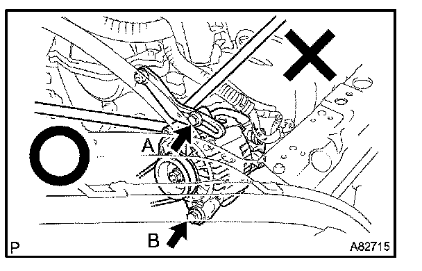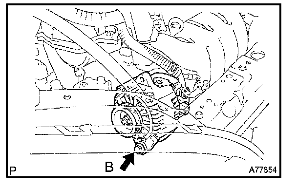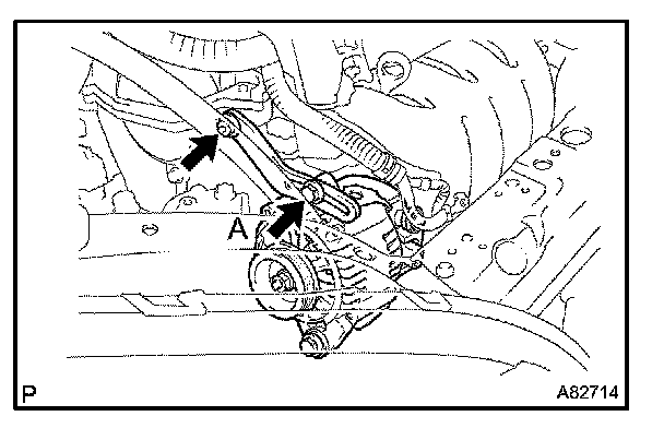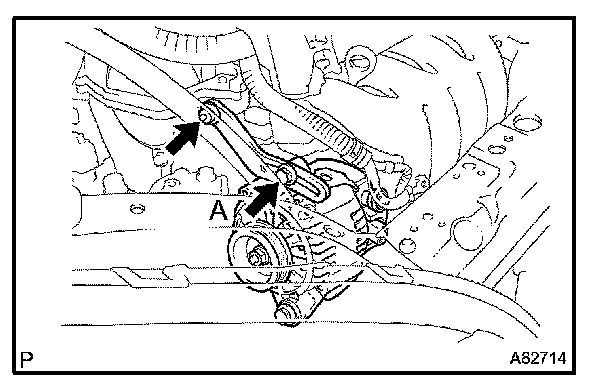 b. Temporarily install the fan belt adjusting bar with bolt A, and tighten the nut to the specified torque.