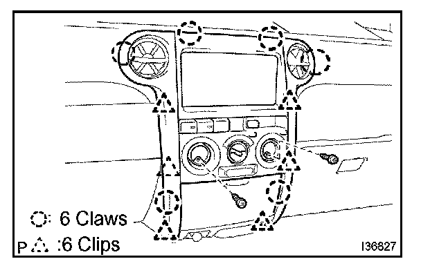 b. Using a moulding remover, disengage the 6 claws and 6 clips, then remove the instrument cluster finish panel sub-assembly CTR.