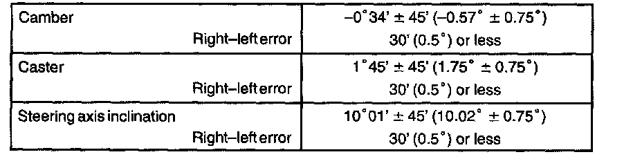If the caster and steering axis inclination are not within the specified values, after the camber has been correctly adjusted, recheck the suspension parts for any damage and/or worn-out parts.