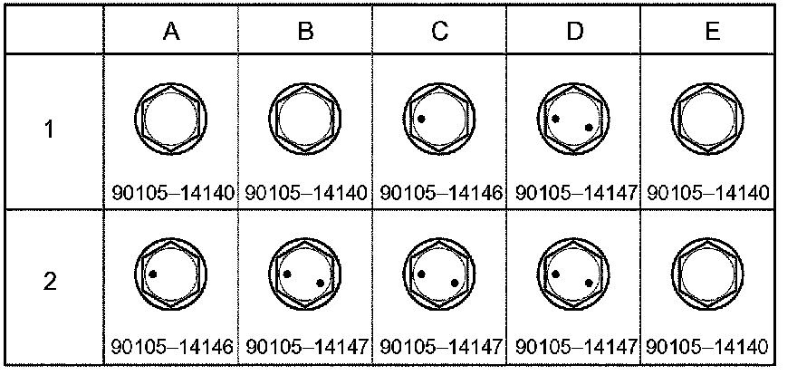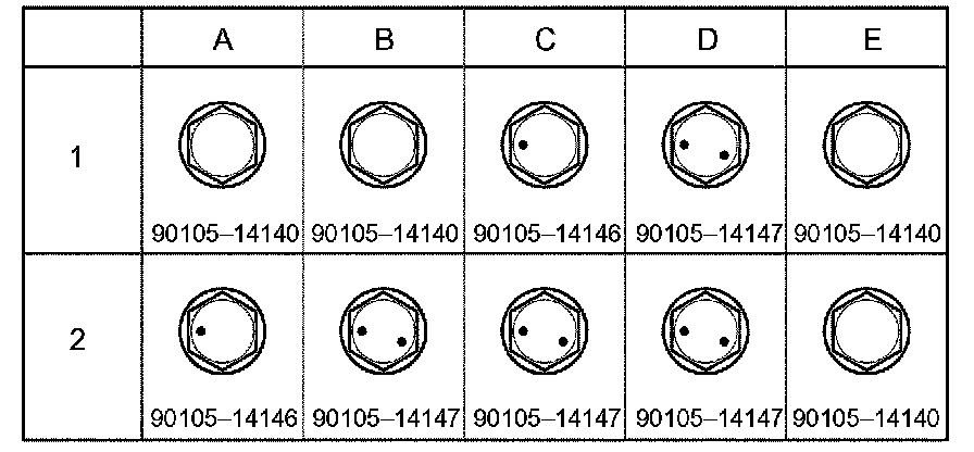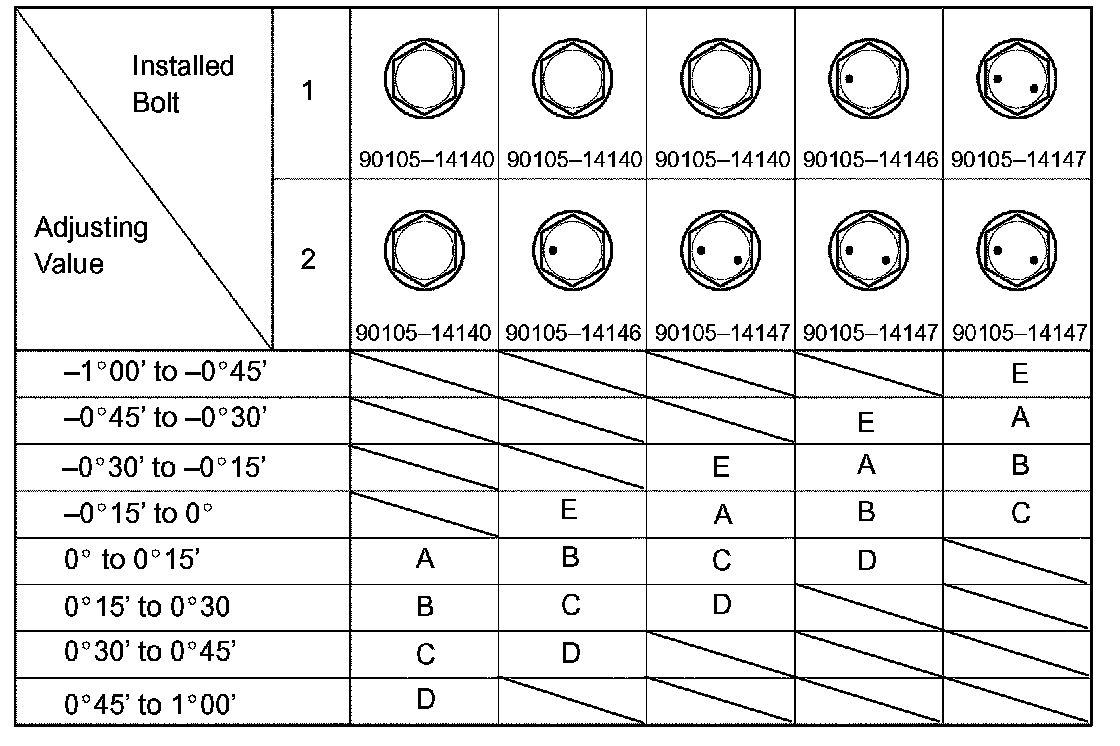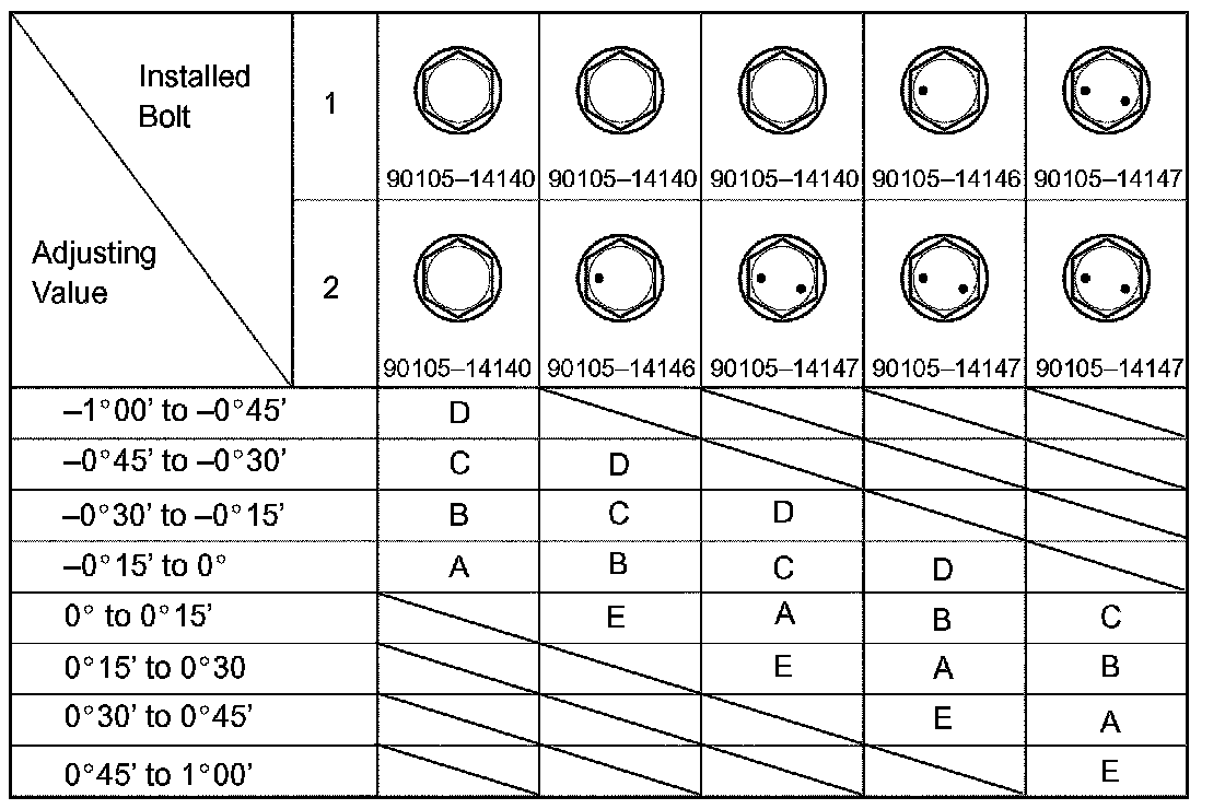 Check installed bolts combination. Select appropriate bolts from the table below to adjust the camber to within the specified range.