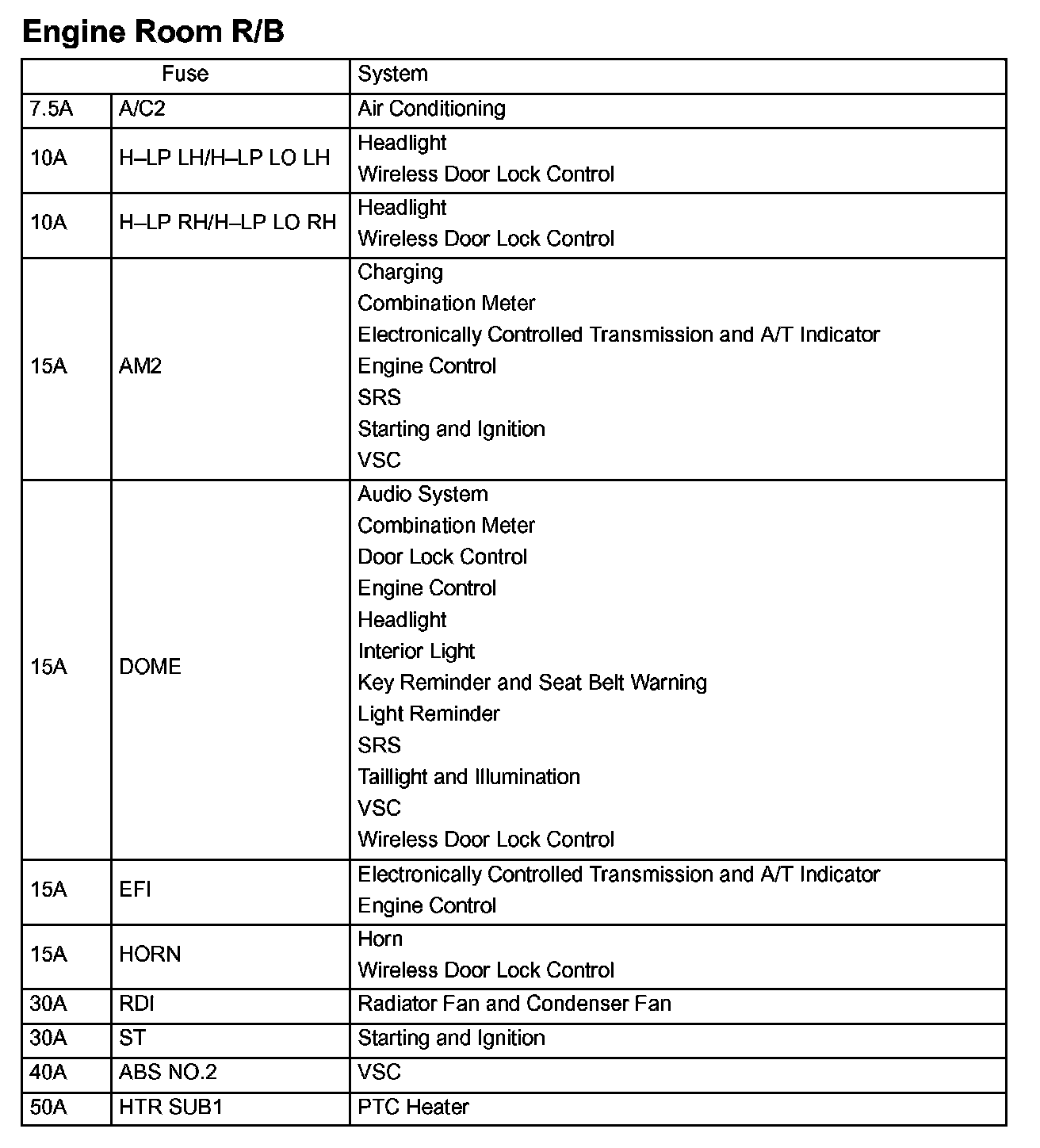 Engine Room Fuse Details