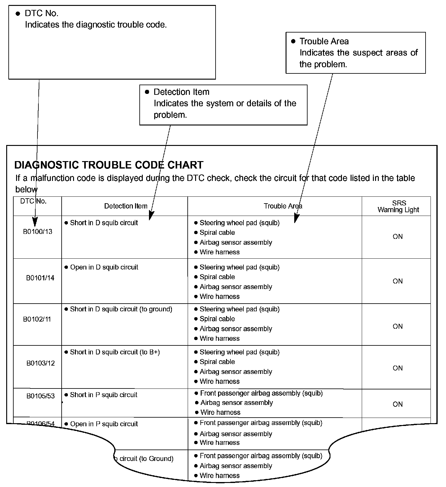 DIAGNOSTIC TROUBLE CODE CHART Use Diagnostic Trouble Codes (DTCs) (from the DTC Checks) in the table to determine the trouble area and proper inspection procedure. The Supplemental Restraint System (SRS) diagnostic trouble code chart is shown as an example.