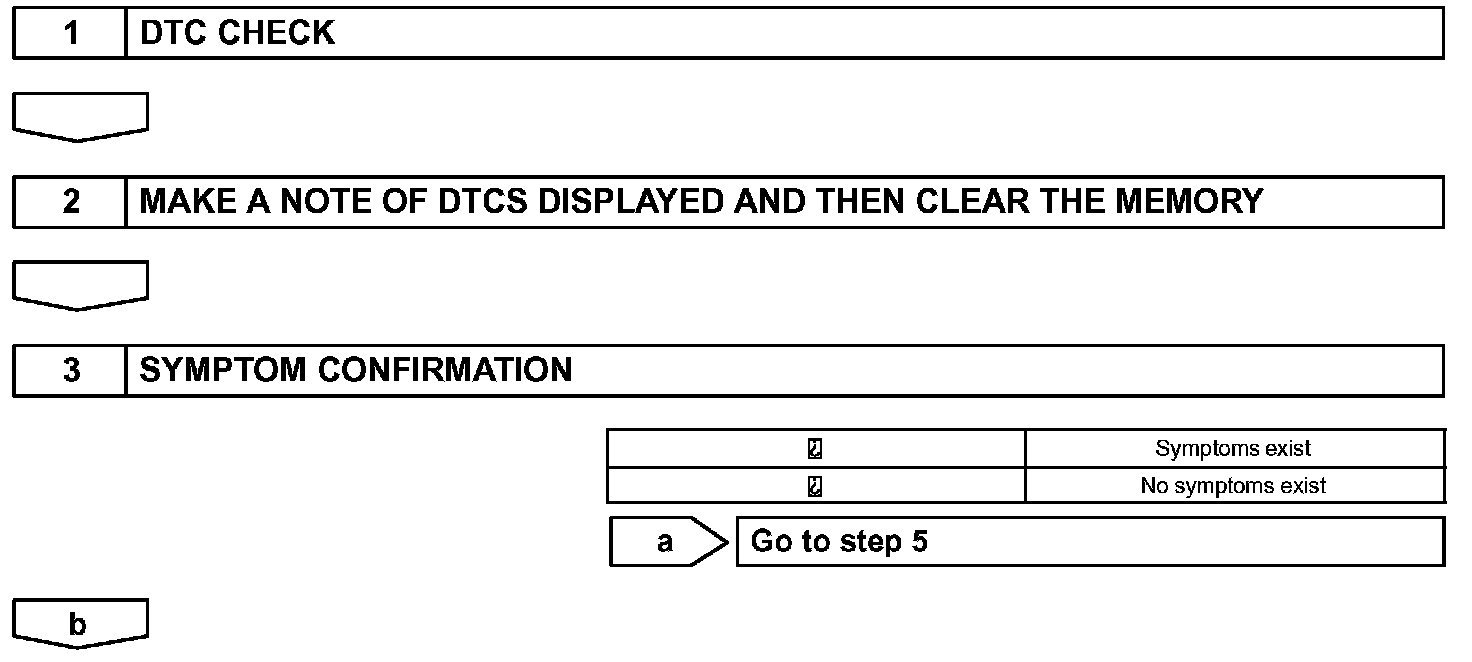 - A flow chart showing how to proceed with troubleshooting using the DTC Check is shown. Directions from the flow chart will indicate how to proceed either to DTC troubleshooting or to the troubleshooting of the problem symptoms table.