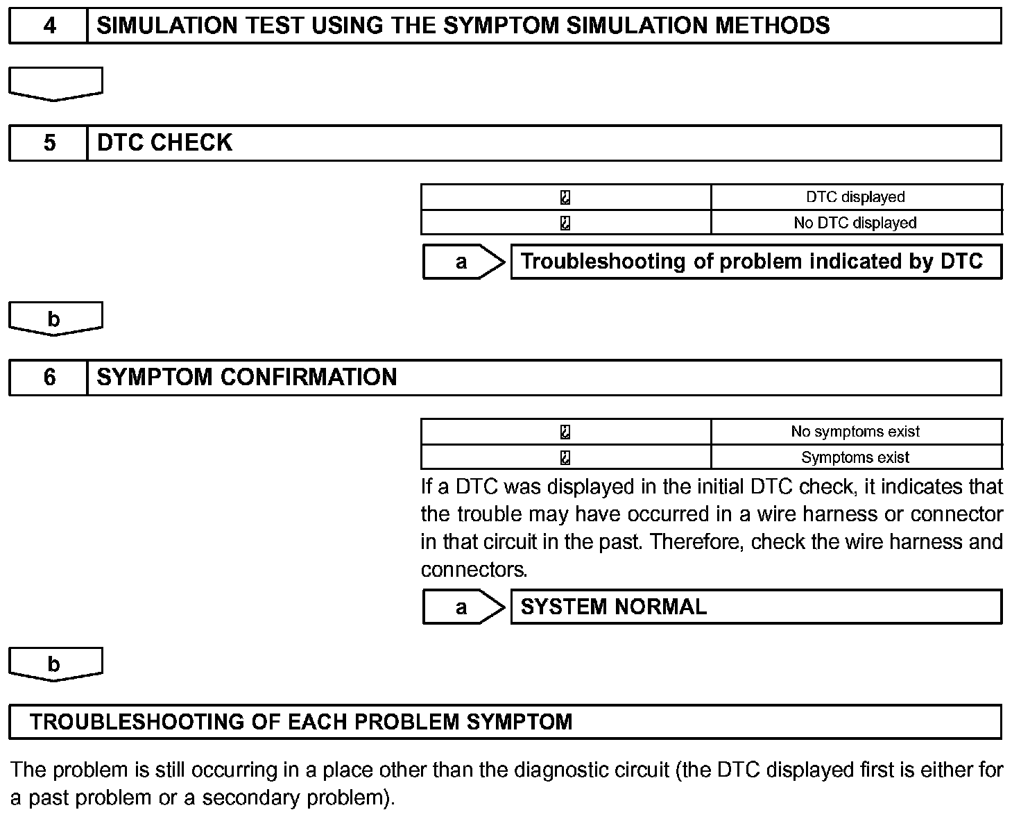 In addition, the DTC should be compared to the problem symptom to see if they are related. For this reason, DTCs should be checked before and after confirmation of symptoms (i.e., whether or not problem symptoms exist) to determine current conditions, as shown in the table.