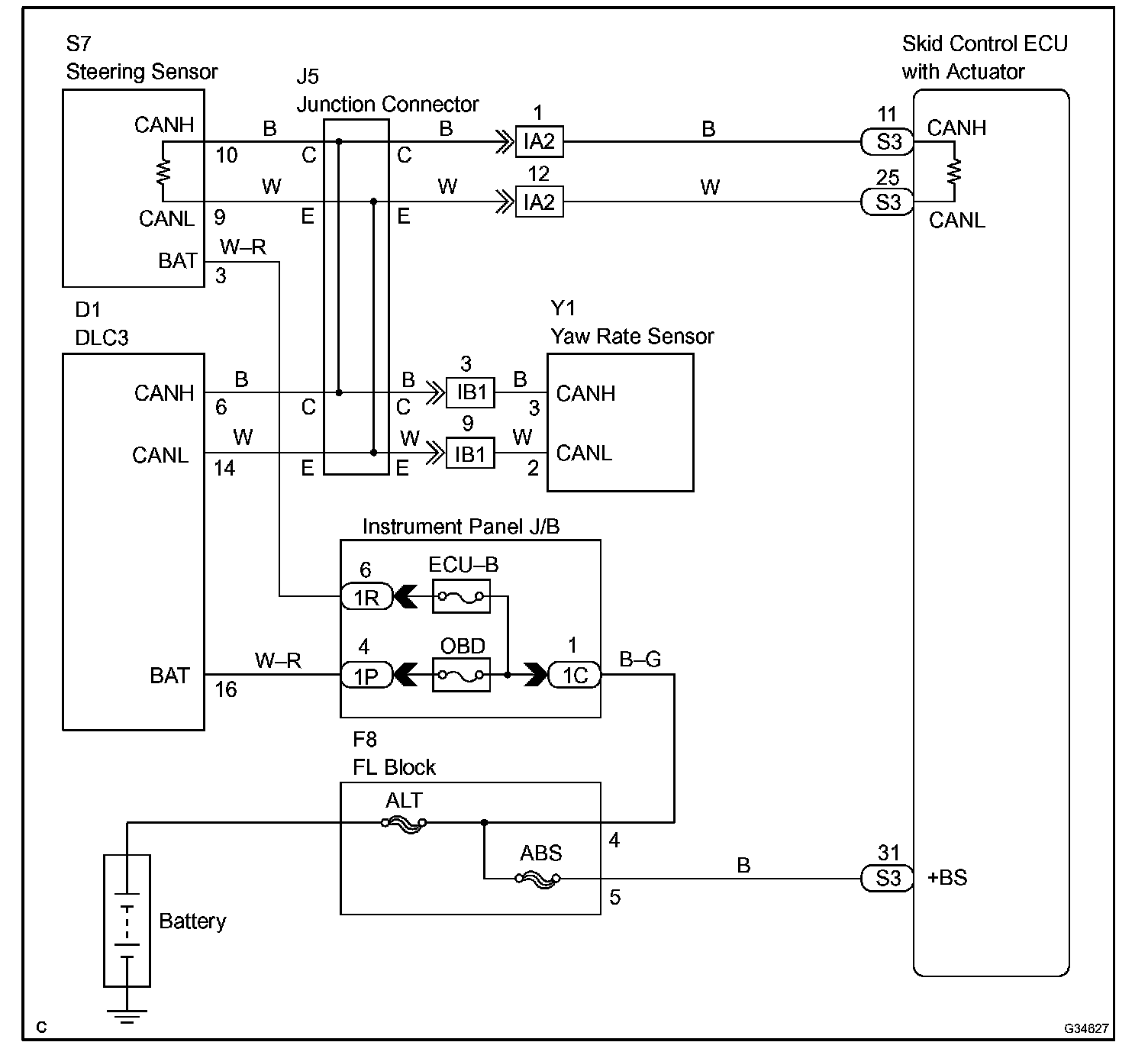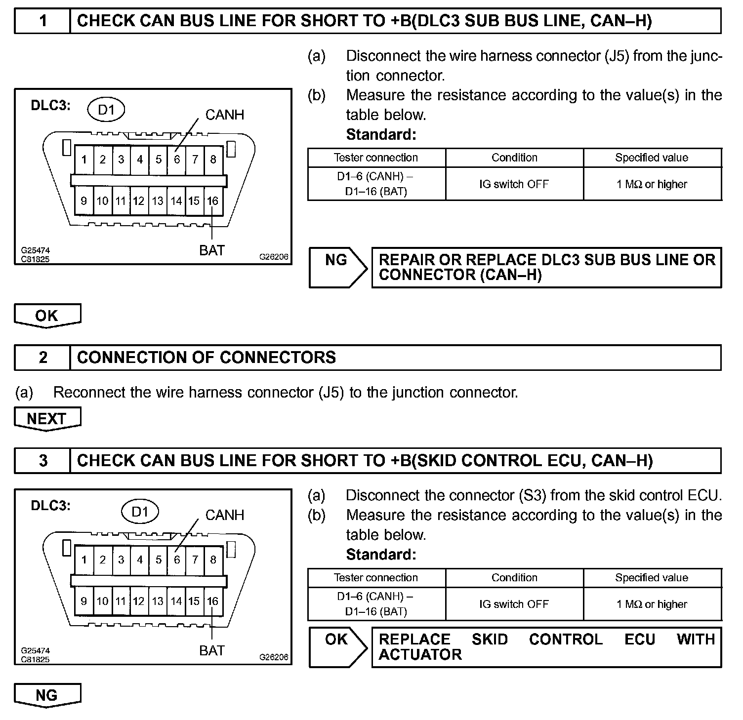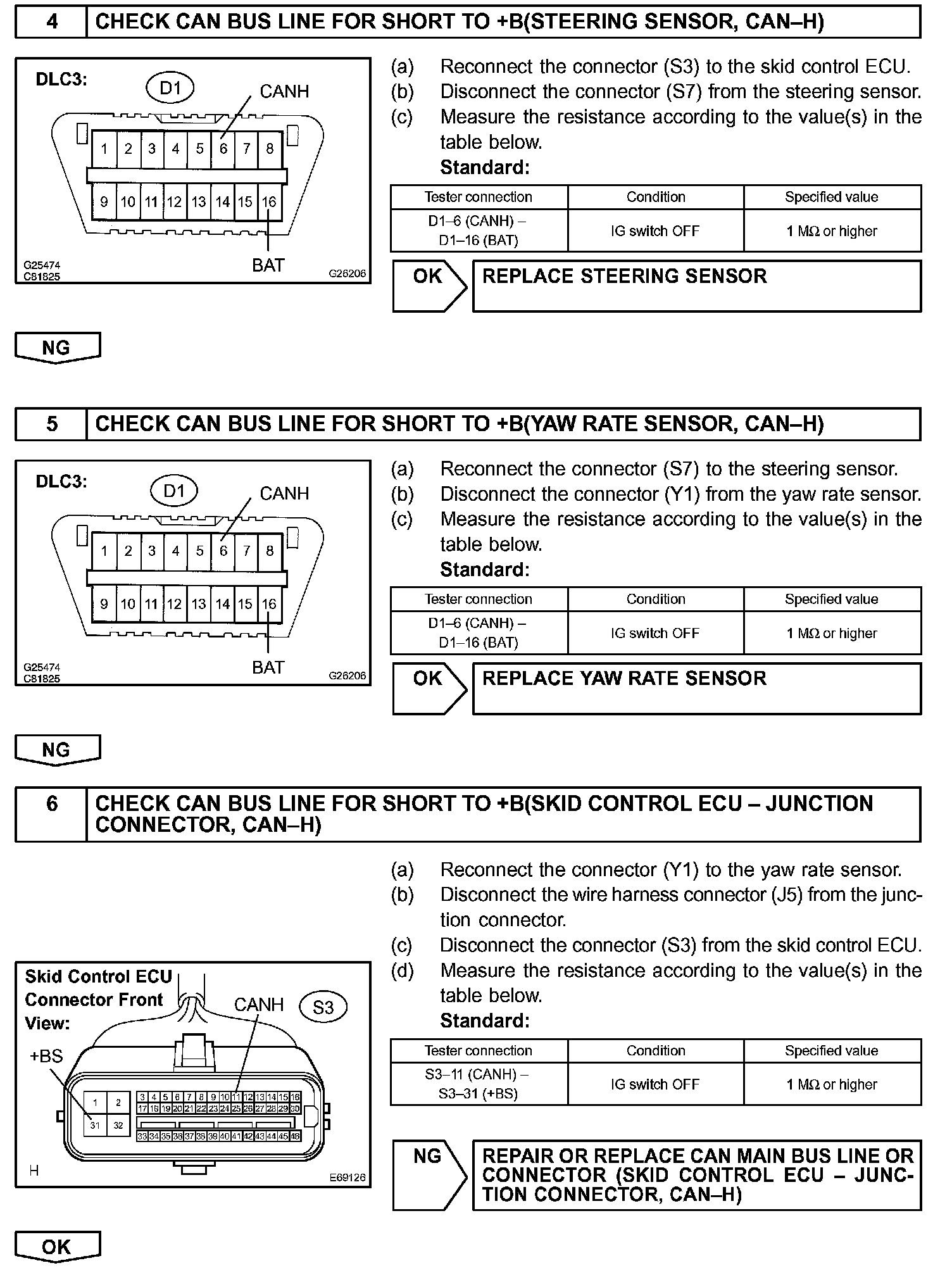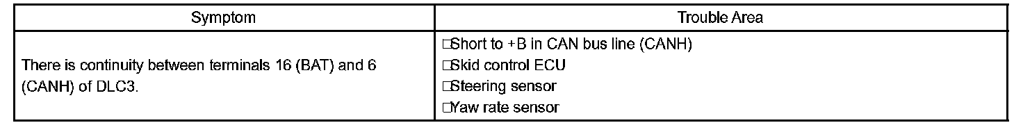 CHECK CAN BUS LINE (CAN-H) FOR SHORT TO +B CIRCUIT DESCRIPTION A short to +B is suspected in the CAN bus line when there is continuity between terminals 16 (BAT) and 6 (CANH) of the