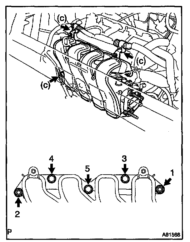 d. In order to remove the intake manifold, using several steps, remove the 3 bolts and 2 nuts in the sequence shown in the illustration.