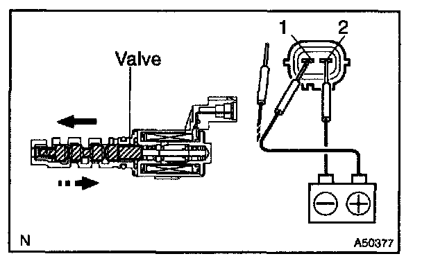 1. Connect the battery positive (+) lead to terminal 1 and negative (-) lead to terminal 2, and check the movement of the valve.