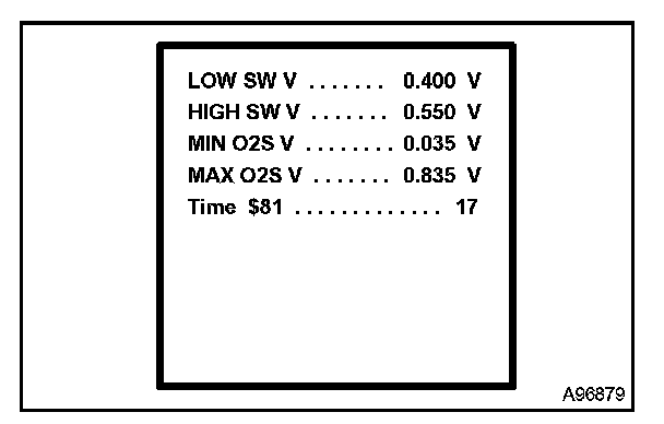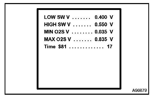 NOTE: Until the HO2 sensor monitor runs to completion, when it fails to complete or when the ignition switch is turned to OFF, the tester screen displays the upper and lower view-able limit values for the monitor (for example, voltages: 0 V and 1.275 V, seconds: 0 and 10.2, and Test Value: 0 and 255).