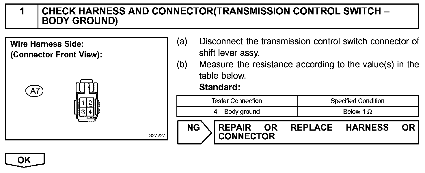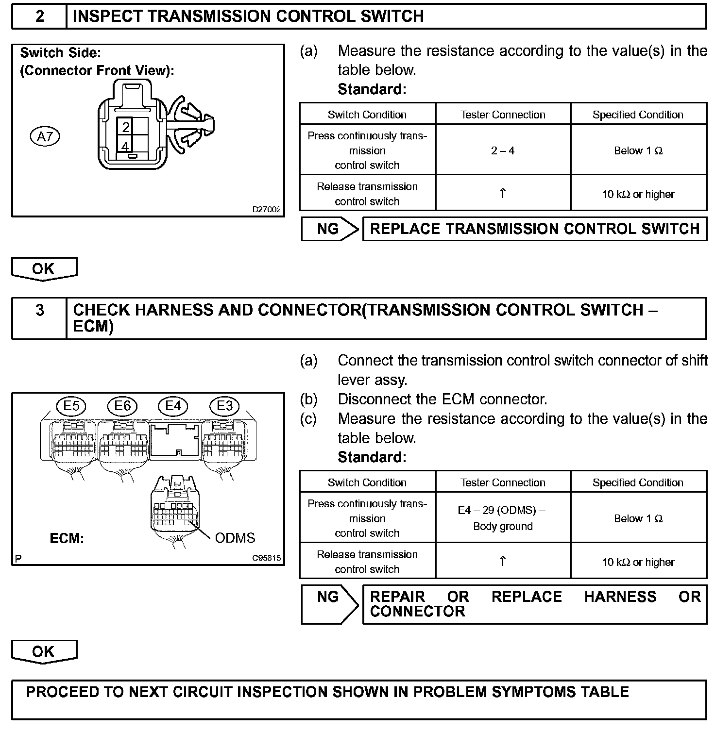 The O/D main switch (transmission control switch) is a momentary type switch. When pressing the O/D main switch, the O/D OFF indicator light lights up and the ECM prohibits shifting into O/D, and when pressing it once again, the O/D OFF indicator light goes off and the ECM allows shifting into O/D. Turning the IG switch OFF will reset the O/D OFF indicator light.