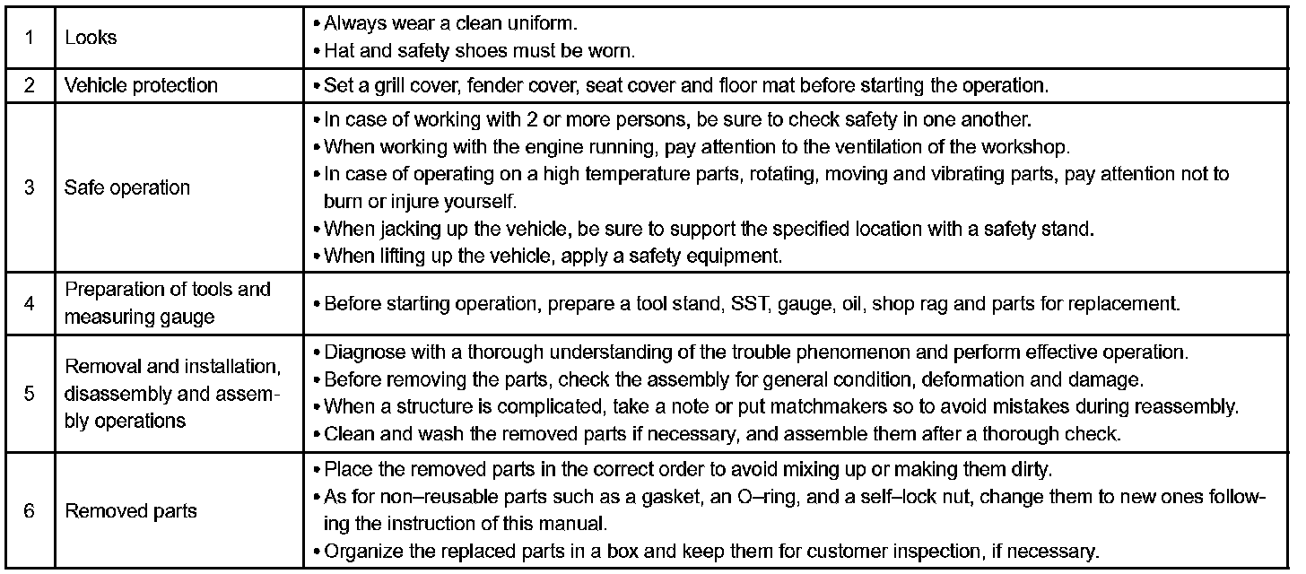 1. Care must be taken when jacking up and supporting the vehicle. Be sure to lift and support the vehicle at the proper locations.