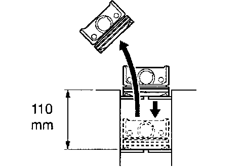 Using a piston, push the piston ring a little beyond the bottom of the ring travel, 110 mm (4.33 inch) from the top of the cylinder block.
