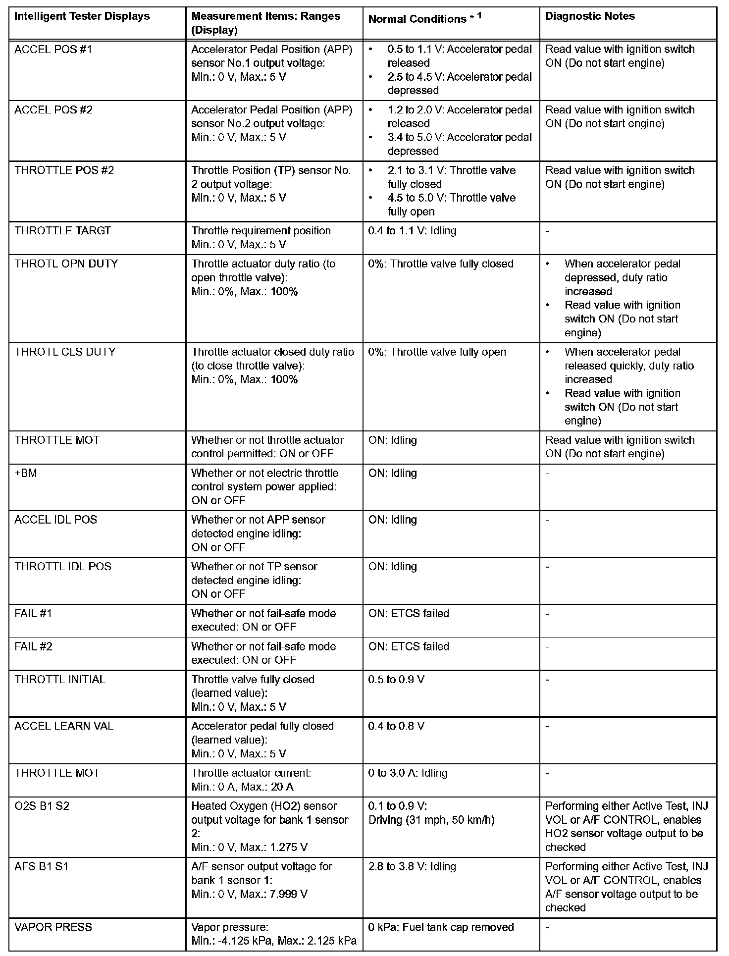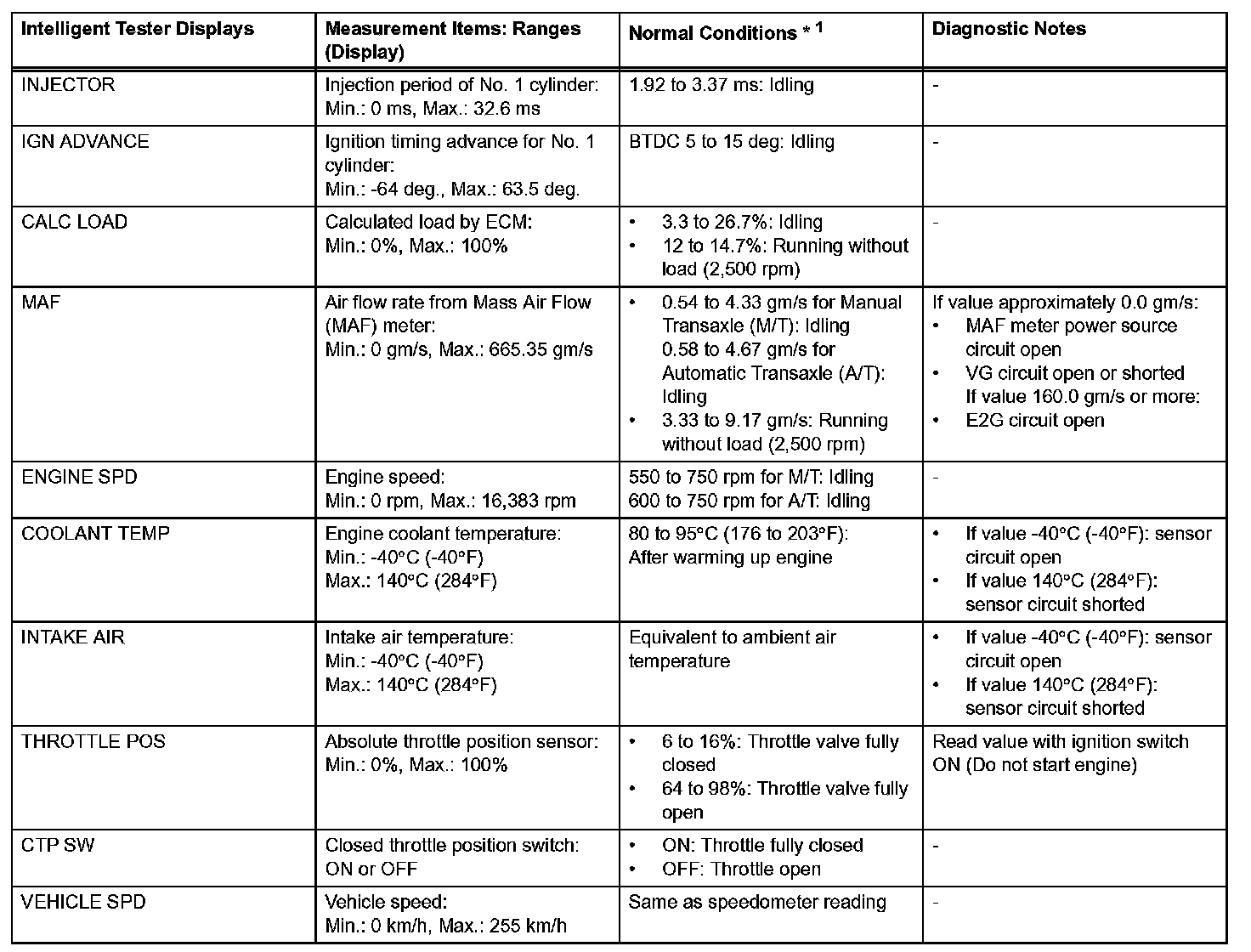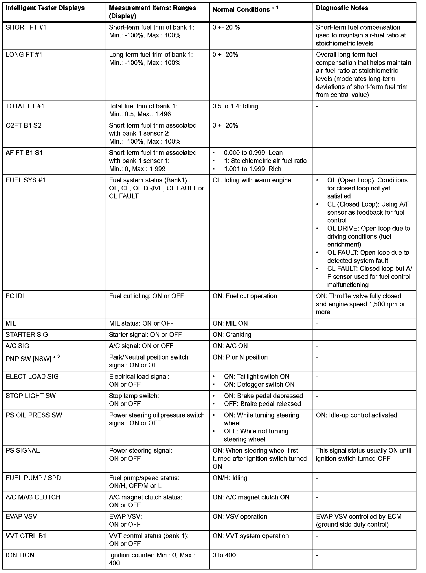 DATA LISTHINT: By reading the DATA LIST displayed on the intelligent tester or OBD II scan tool, you can check values, including those of the switches, sensors, and actuators, without removing any parts. Reading the DATA LIST as the first step of troubleshooting is one method of shortening diagnostic time.