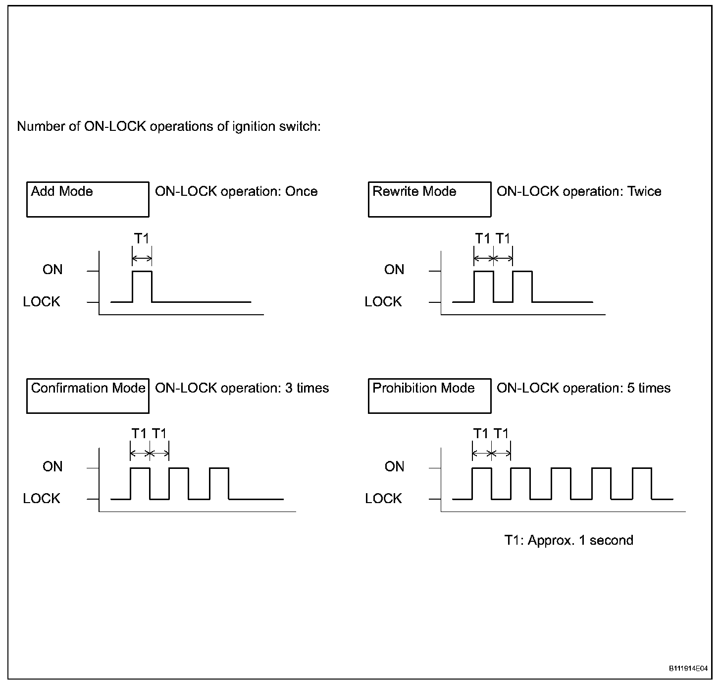 1. Turn ignition switch from LOCK to ON and back to LOCK at approximately 1 second intervals according to the number of times given.