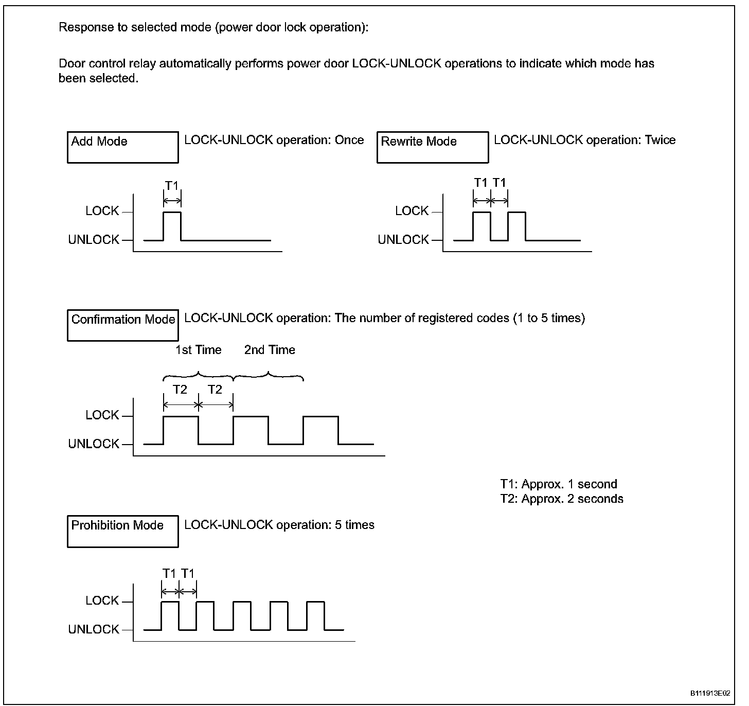 - In confirmation mode, the LOCK-UNLOCK operation will occur once for each recognition code that has been registered. For example, if 2 recognition codes have been registered, the LOCK-UNLOCK operation will occur 2 times.