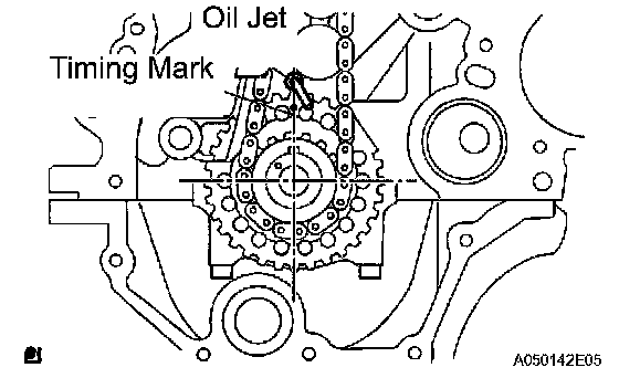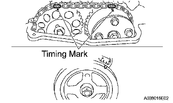 2) Check that both timing marks on the camshaft timing sprocket and the camshaft timing gear are facing upward as shown in the illustration.
