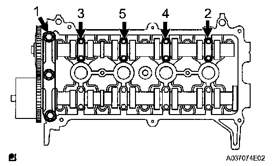 a) Using several steps, uniformly loosen and remove the 8 bearing cap bolts in the sequence shown in the illustration, and then remove the 4 bearing caps and camshaft.