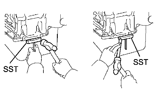 c) Insert the blade of SST between the oil pan and No. 2 oil pan, cut off the applied sealer and remove the No. 2 oil pan.