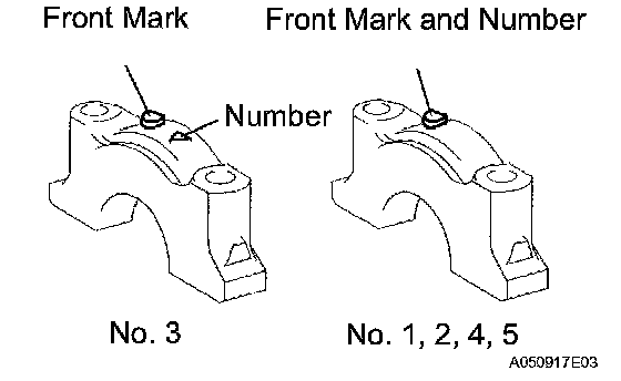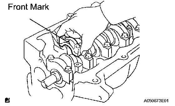 g) Check the front marks and numbers and install the bearing caps onto the cylinder block.