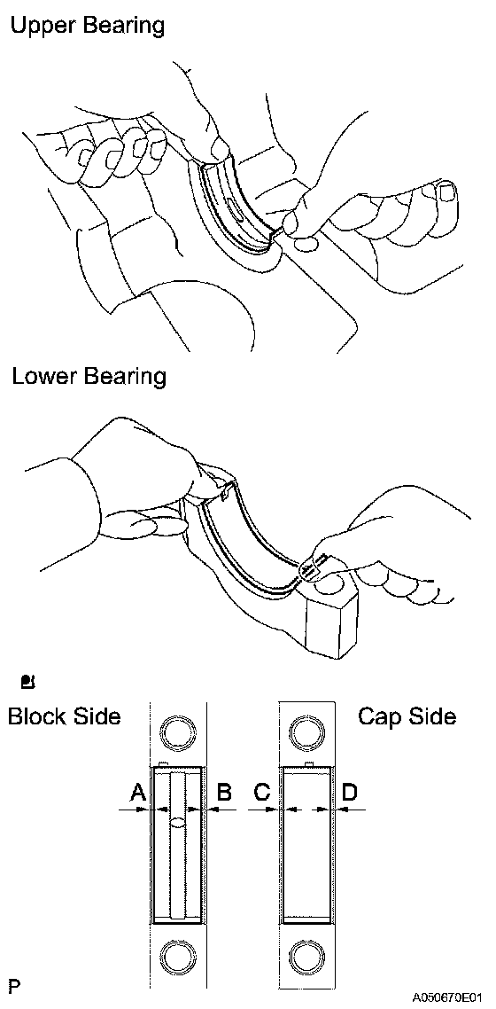 d) Install the upper bearing with the oil groove onto the cylinder block, and the lower bearing onto the bearing cap.