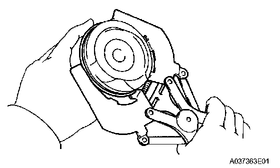 b) While rotating the stopper plate of the tensioner downward, insert a 2.5 mm (0.098 inch) diameter bar into the holes of the stopper plate and the tensioner to hold the stopper plate.