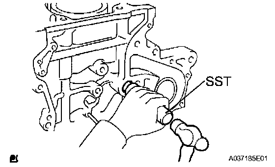 2) Using SST and a hammer, tap in a new oil seal until its surface is flush with the timing chain cover edge.