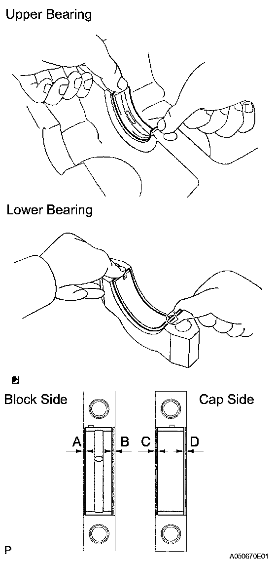 a) Install the upper bearing with the oil groove onto the cylinder block, and the lower bearing onto the bearing cap.