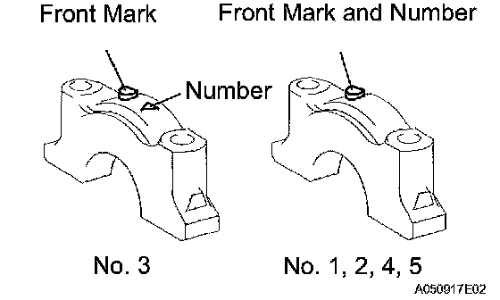 d) Check the front marks and numbers and install the bearing caps onto the cylinder block.