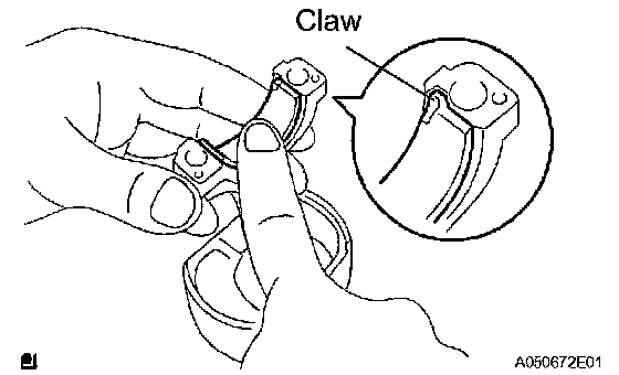 HINT: Mass production parts do not have claws as marks. If reusing the mass production parts, measure the clearance of both sides with the bearing in the center of the bearing cap.