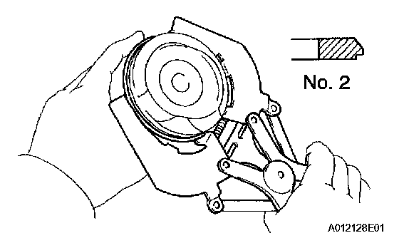 f) While rotating the stopper plate of the tensioner downward, insert a 2.5 mm (0.098 inch) diameter bar into the holes of the stopper plate and the tensioner to hold the stopper plate.