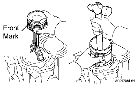 c) Using a piston ring compressor, push the correctly numbered piston and connecting rod assemblies into each cylinder with the front mark on the piston facing forward.