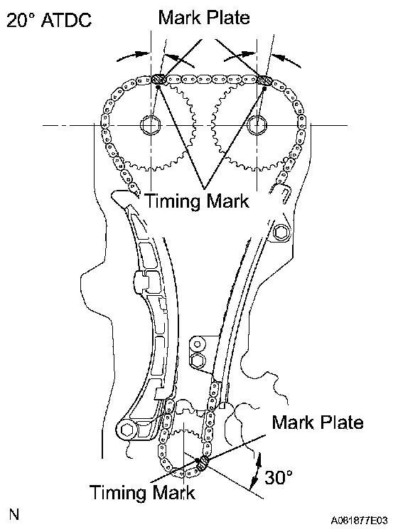 2) Set the cams of the intake and exhaust timing sprockets to 20° ATDC.
