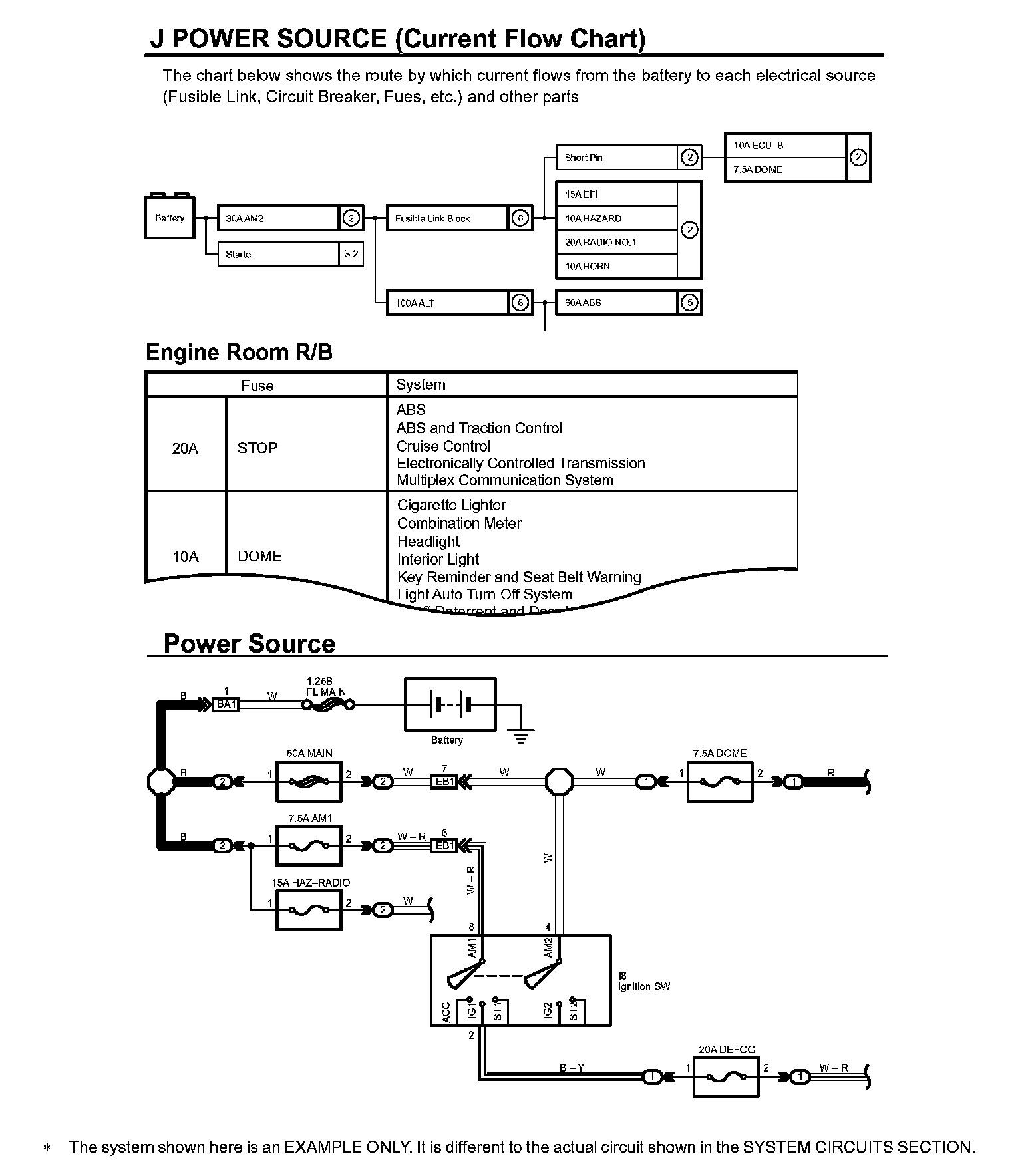 HOW TO READ POWER SOURCEThe Current Flow Chart section, describes which parts each power source (fuses, fusible links, and circuit breakers) transmits current to. In the Power Source circuit diagram, the conditions when battery power is supplied to each system are explained. Since all System Circuit diagrams start from the power source, the power source system must be fully understood