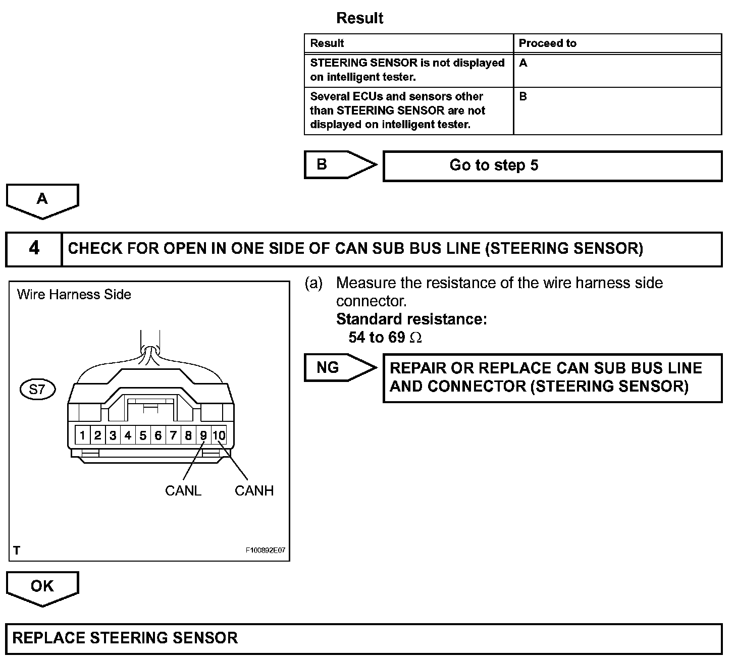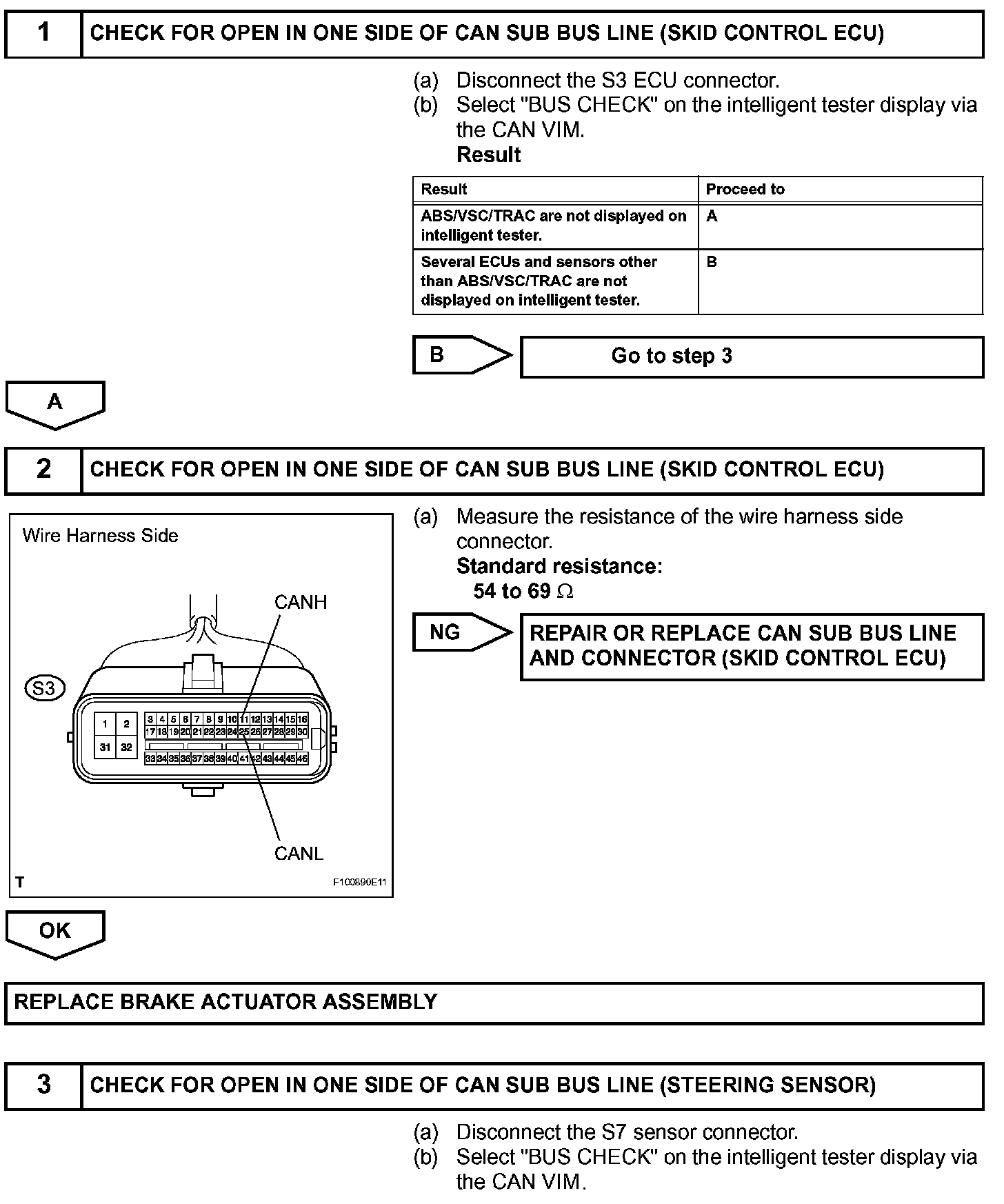 If 2 or more ECUs and/or sensors do not appear on the intelligent tester's "BUS CHECK" screen via the CAN VIM, one side of the CAN sub bus line may be open (One side of the CANH [sub bus line] /CANL [sub bus line] of the ECU and/or sensor is open).