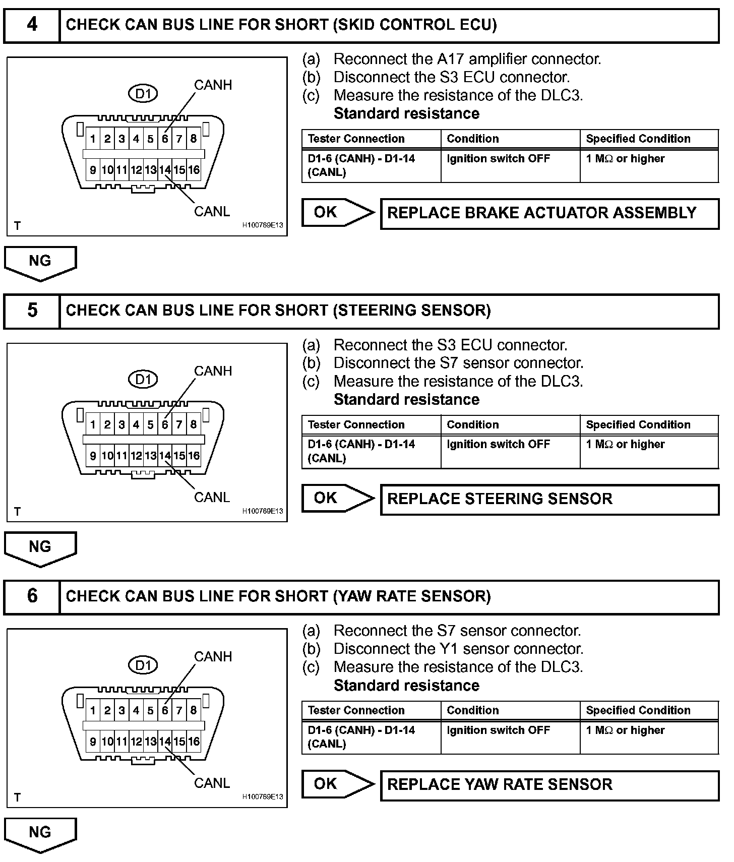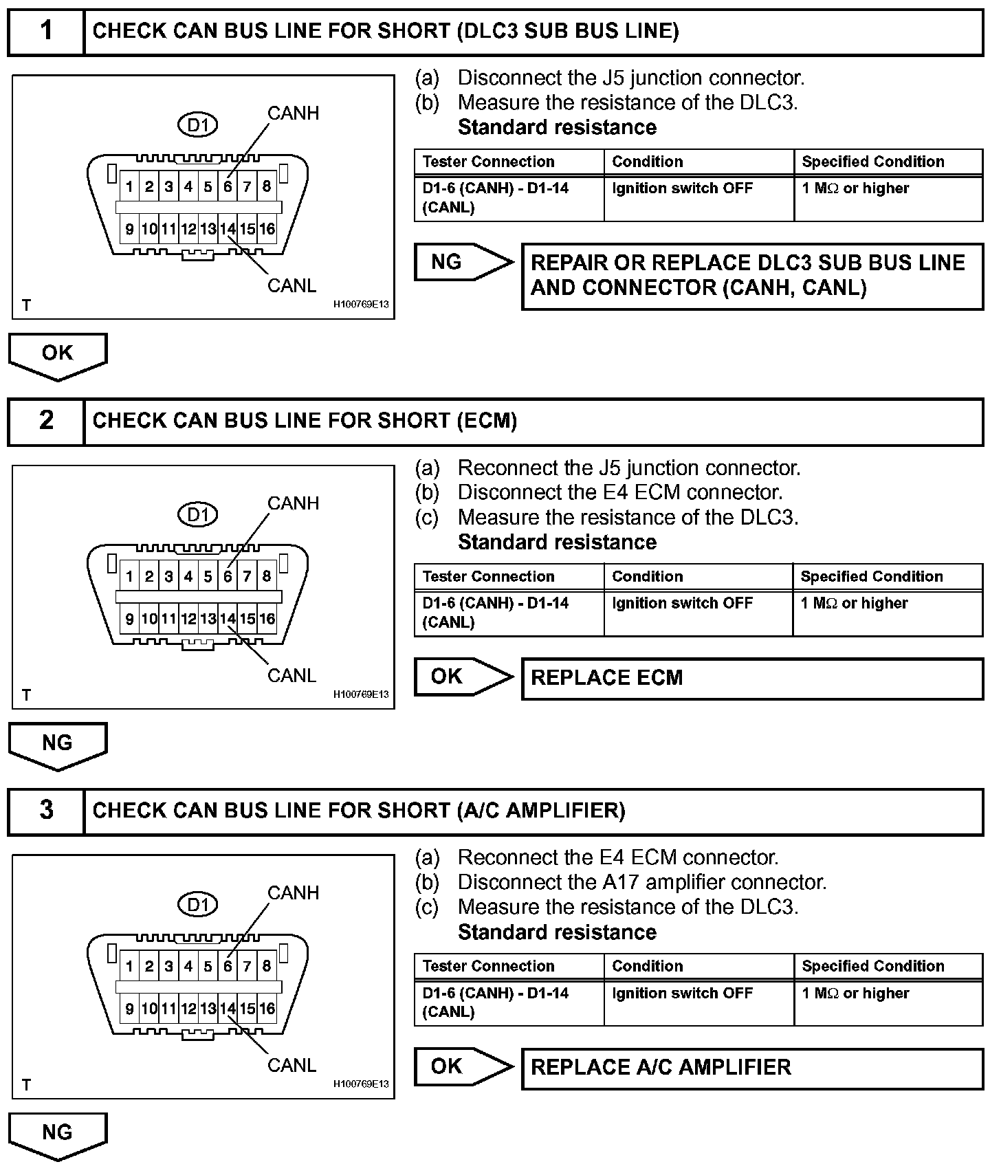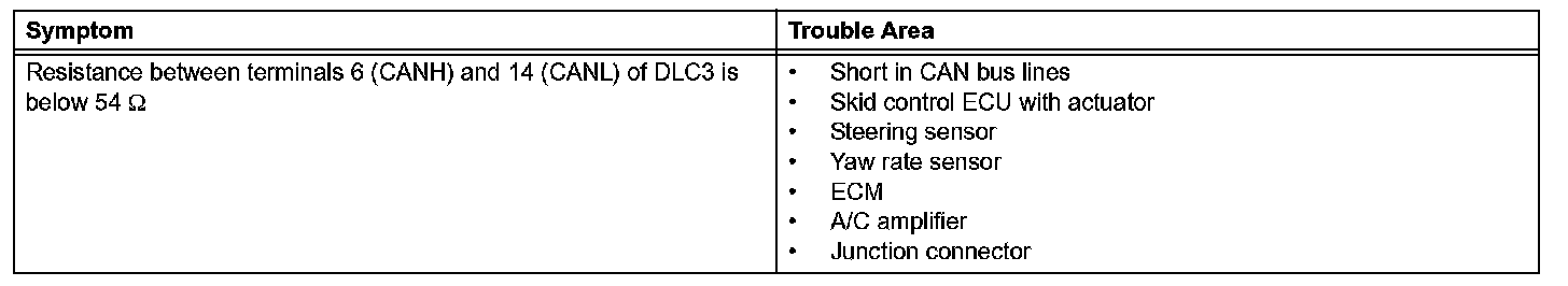 Short in CAN Bus LinesDESCRIPTIONThe CAN bus lines are considered to be shorted when the resistance between terminals 6 (CANH) and 14 (CANL) of the