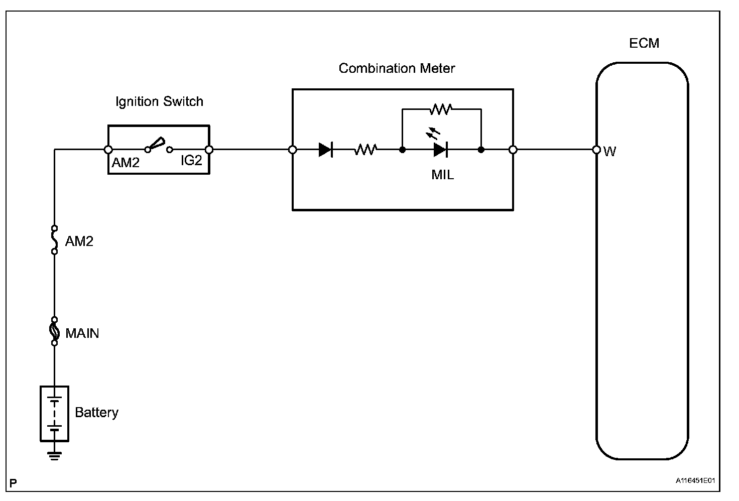The MIL (Malfunction Indicator Lamp) is used to indicate vehicle malfunction detections by the ECM. By turning the ignition switch ON, power is supplied to the MIL circuit, and the ECM provides the circuit ground which illuminates the MIL.