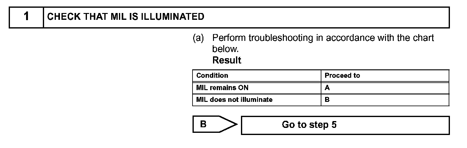 The MIL operation can be checked visually: When the ignition switch is first turned ON, the MIL should be illuminated and should then turn OFF. If the MIL remains illuminated or is not illuminated, conduct the following troubleshooting procedure using the intelligent tester.