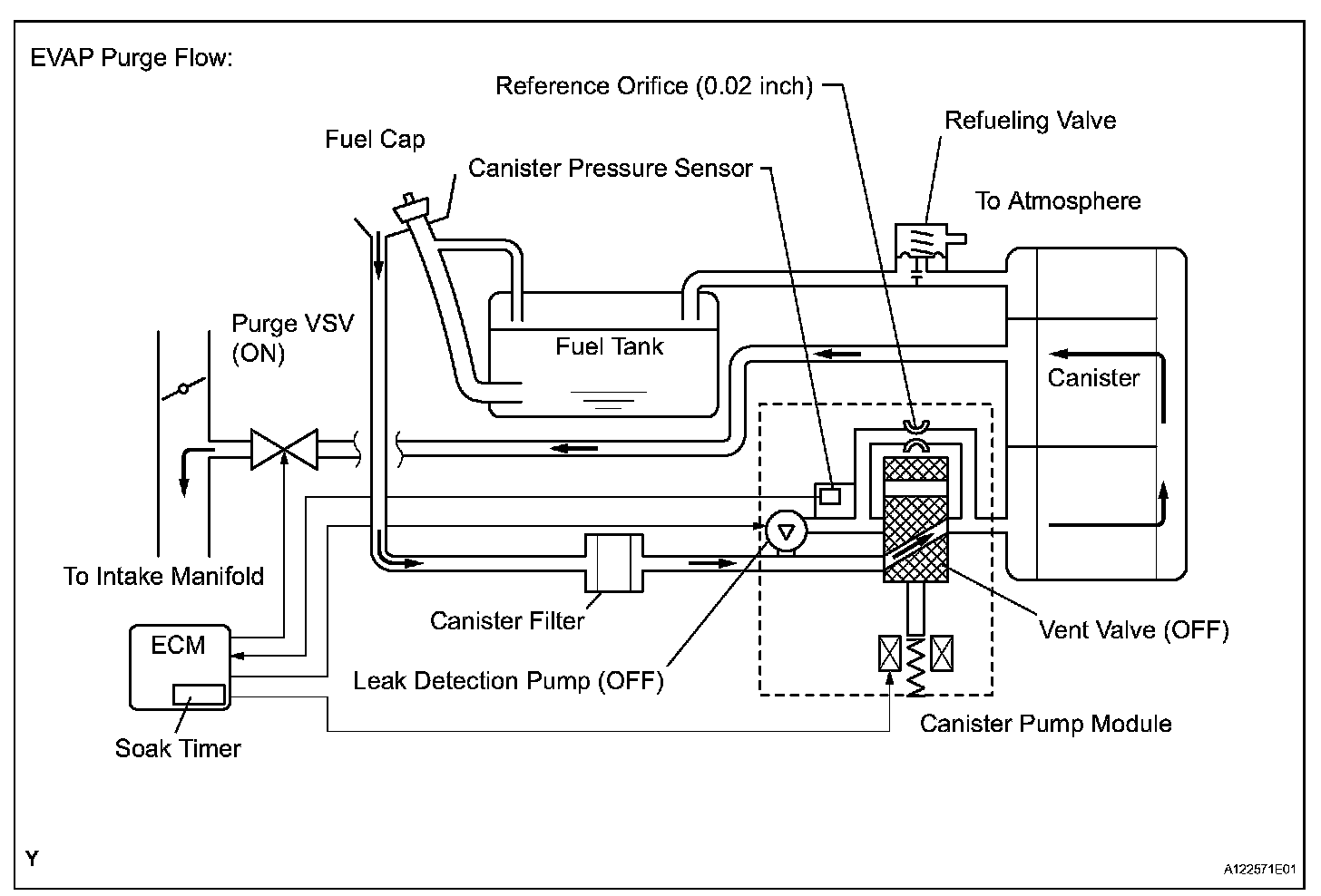 The purge flow volume is also determined by the intake manifold pressure. Atmospheric pressure is allowed into the canister through the vent valve to ensure that the purge flow is maintained when the negative pressure (vacuum) is applied to the canister.